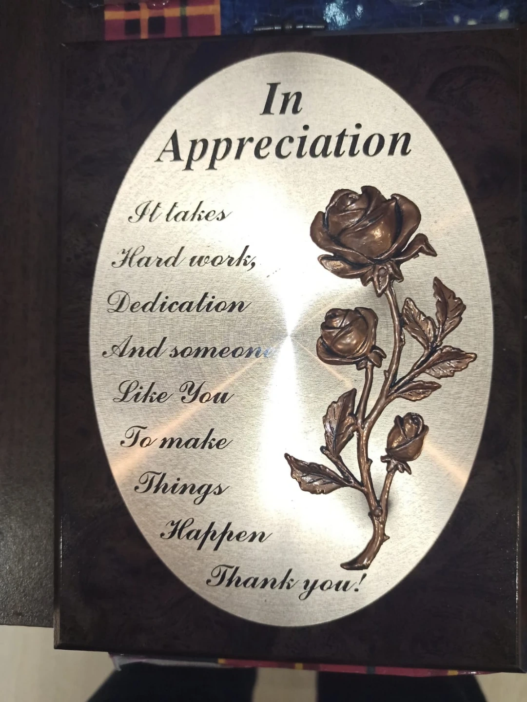 "In Appreciation" plaque with a rose design - $10