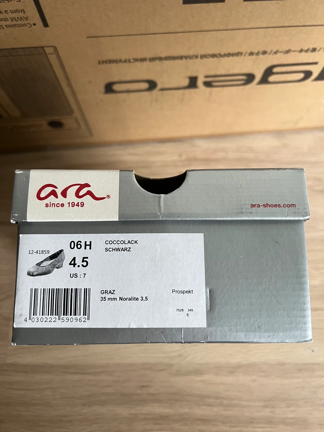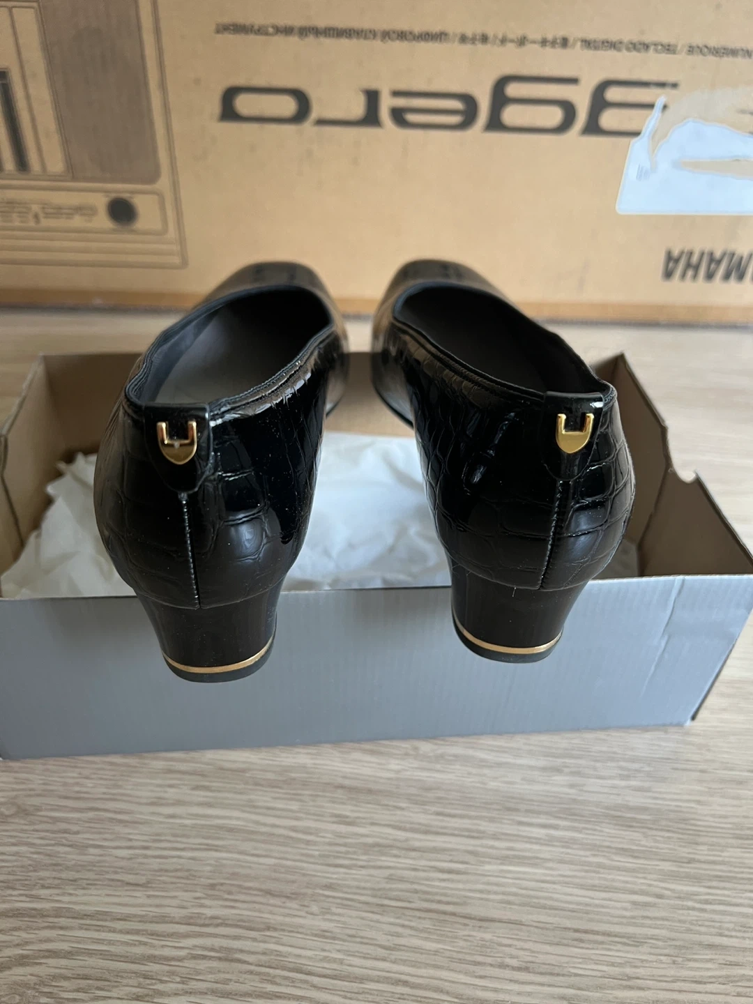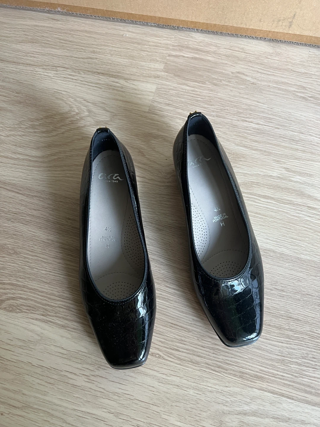 Ara black patent leather short block heels with a croc embossed finish. Nice gold touches on them. They are size 7. They come with the original box. Purchased from a Walking on a cloud shoe store. Ara is a long established German comfort shoe brand. Worn twice. Made in Portugal.