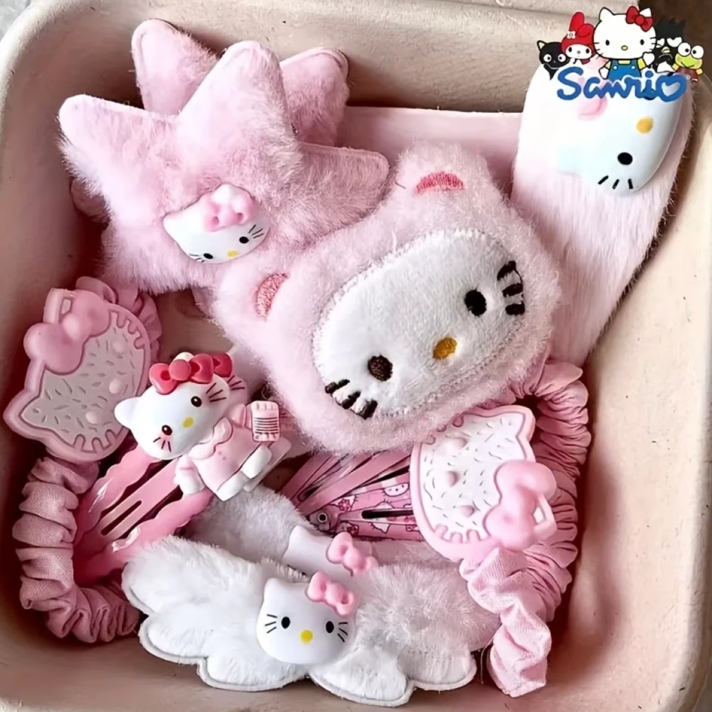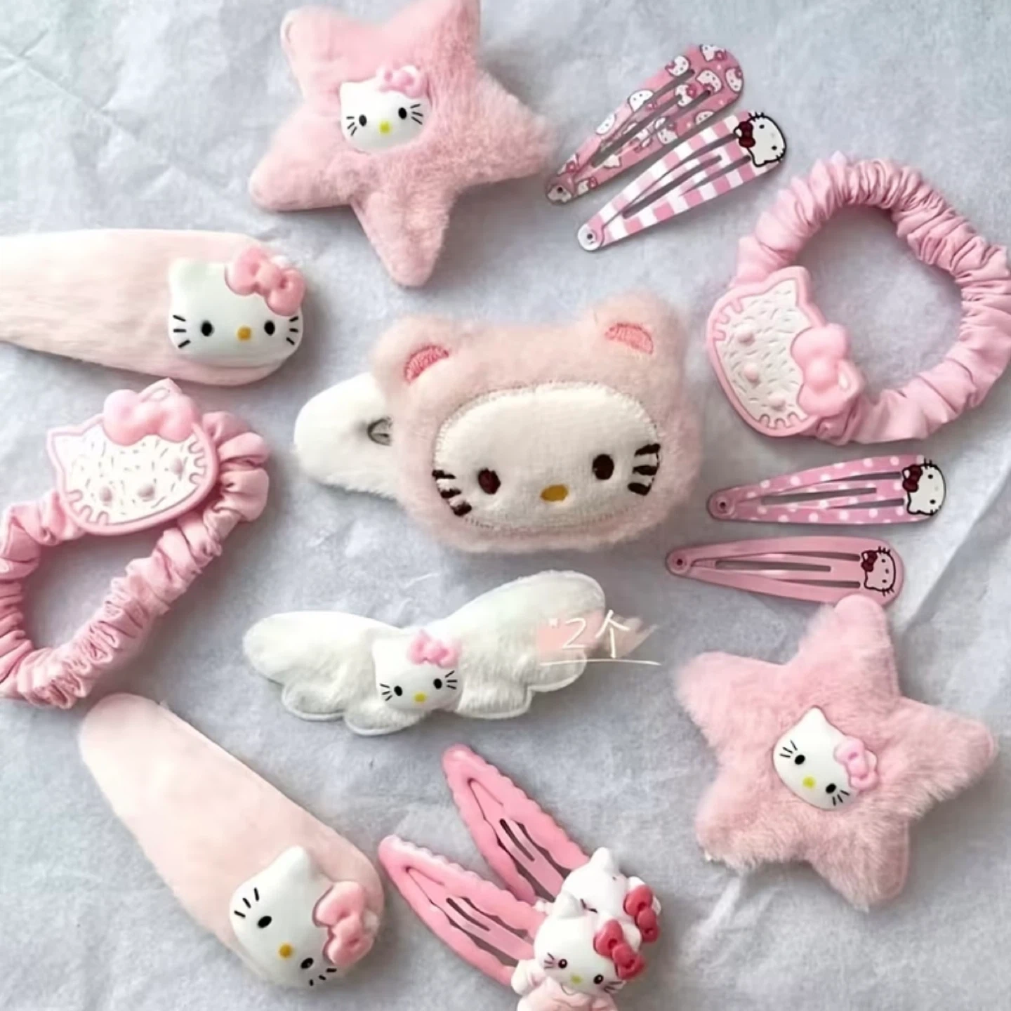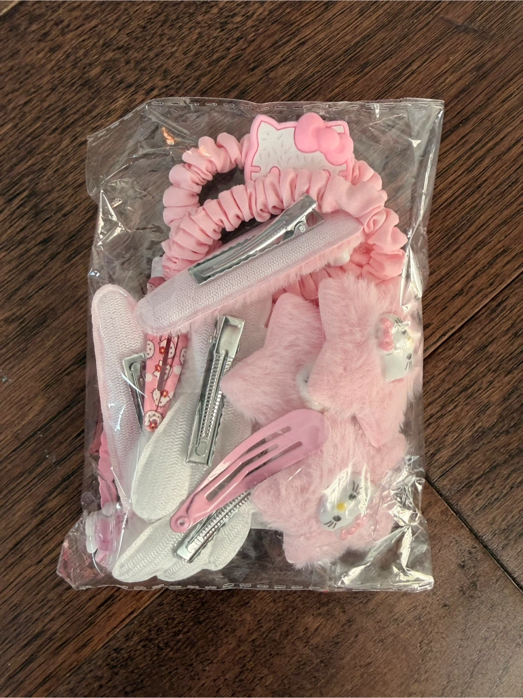 This set includes 15 pieces of pink Hello Kitty themed hair accessories like scrunchies and hair clips. It's perfect for adding a touch of cute to any hairstyle. These accessories are made with soft, fuzzy materials and come in different cute designs.