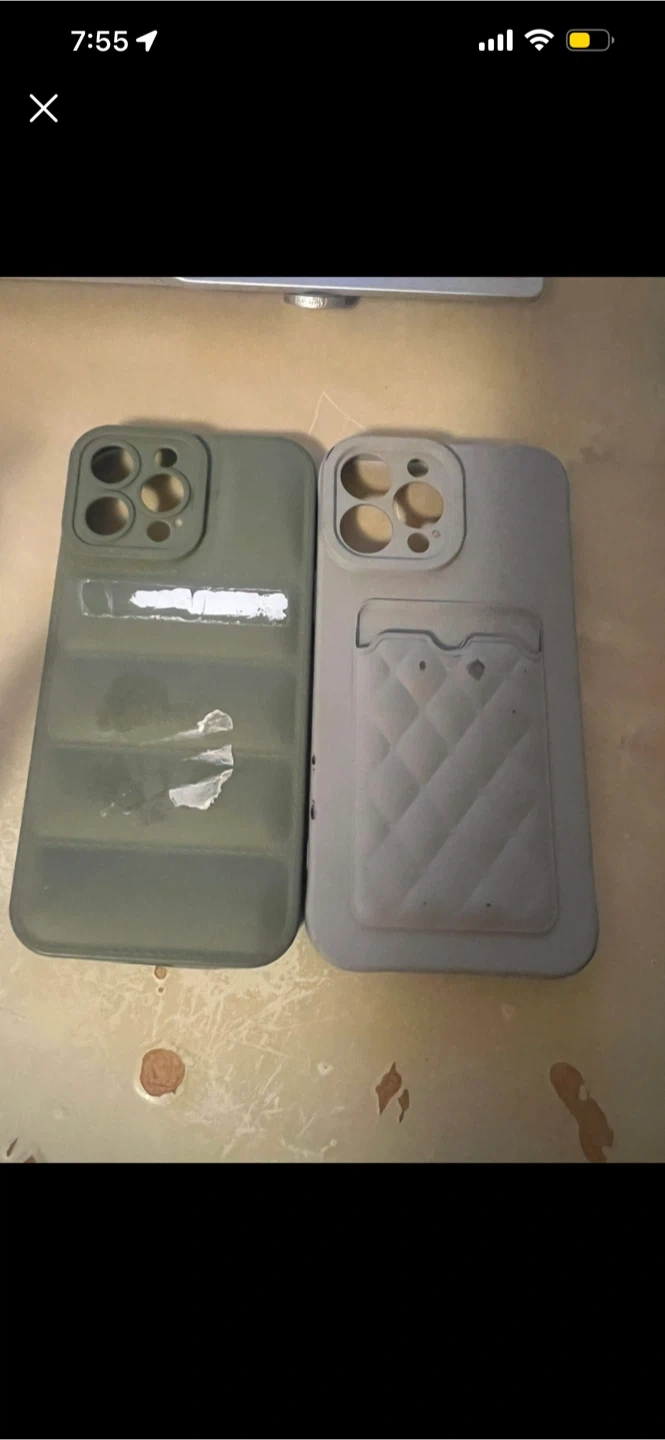 Two phone cases for an iPhone 13 Pro. One is a dark green, ribbed design and the other is a light grey with a quilted cardholder on the back. Both are protective cases.