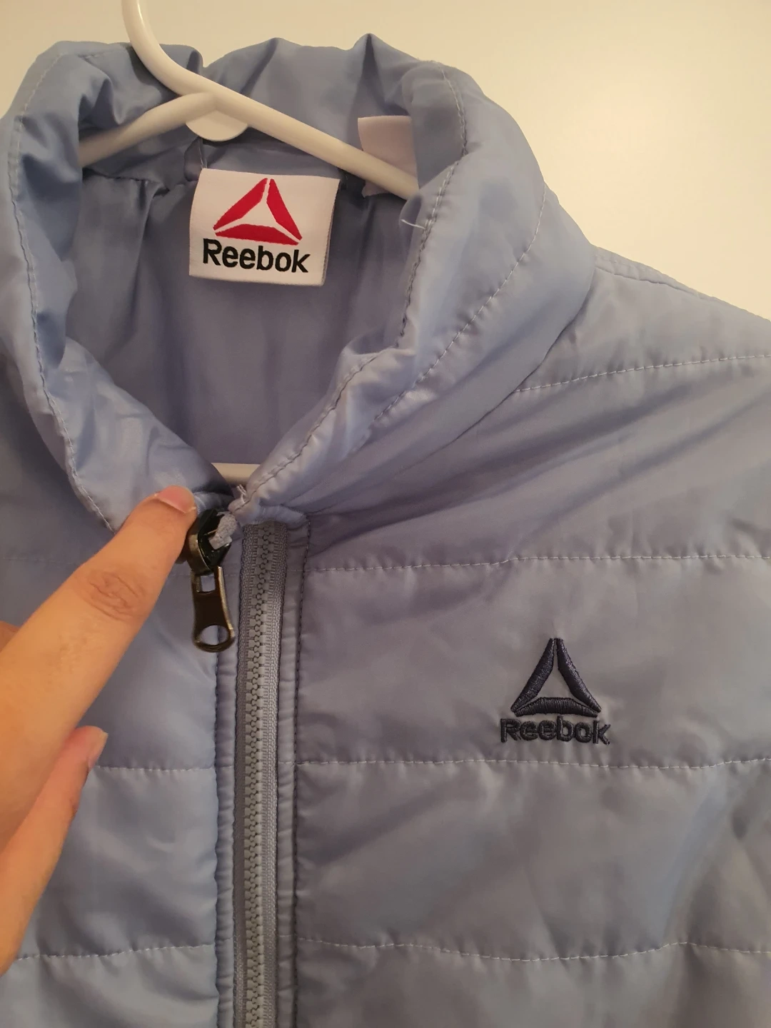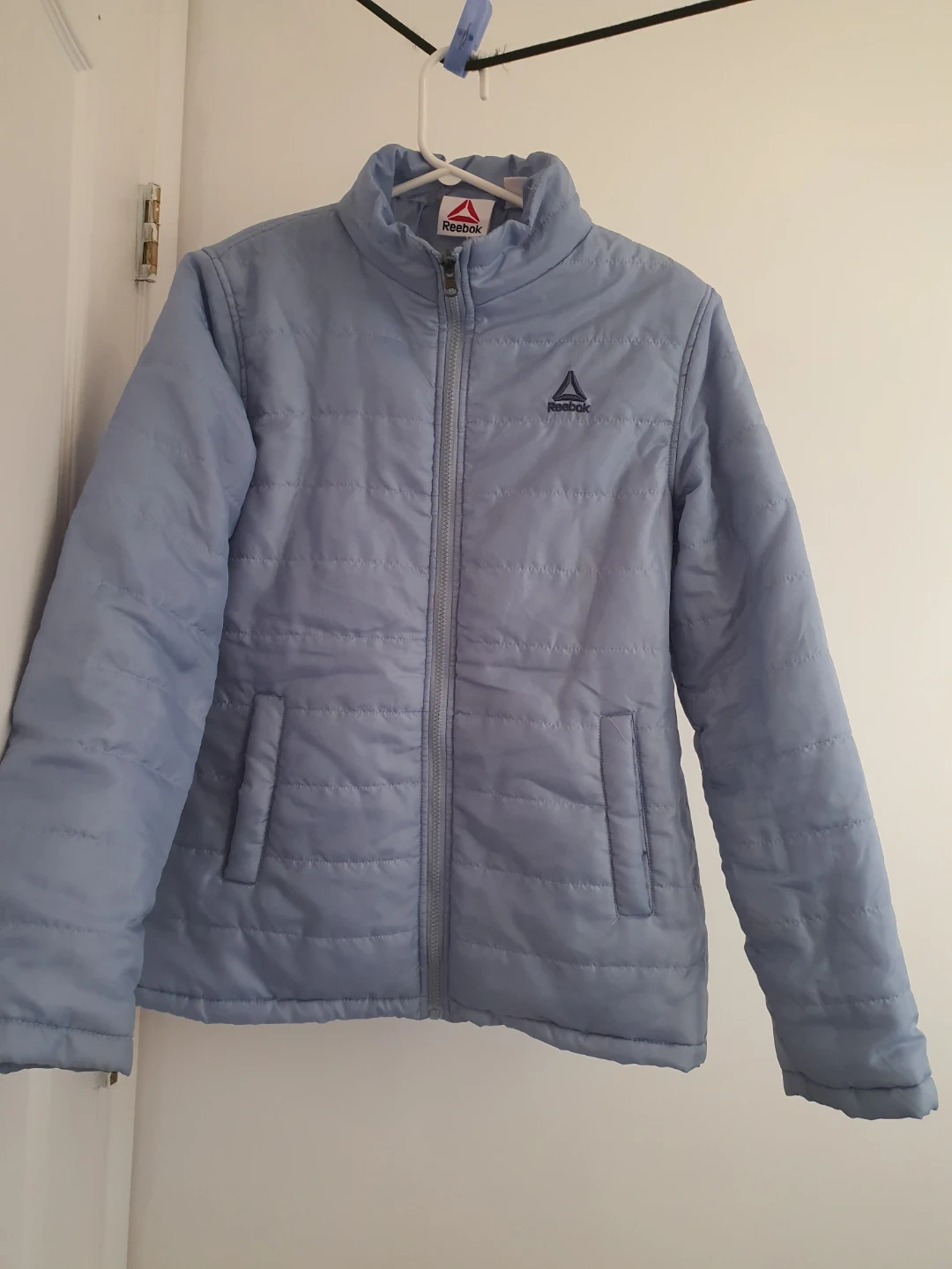 This is a light blue puffer jacket from Reebok. It's quilted for warmth and has two front pockets. Made for casual wear. Size says medium but fits a little large. Barely worn. Can be both men and women wear as it looks gender neutral.