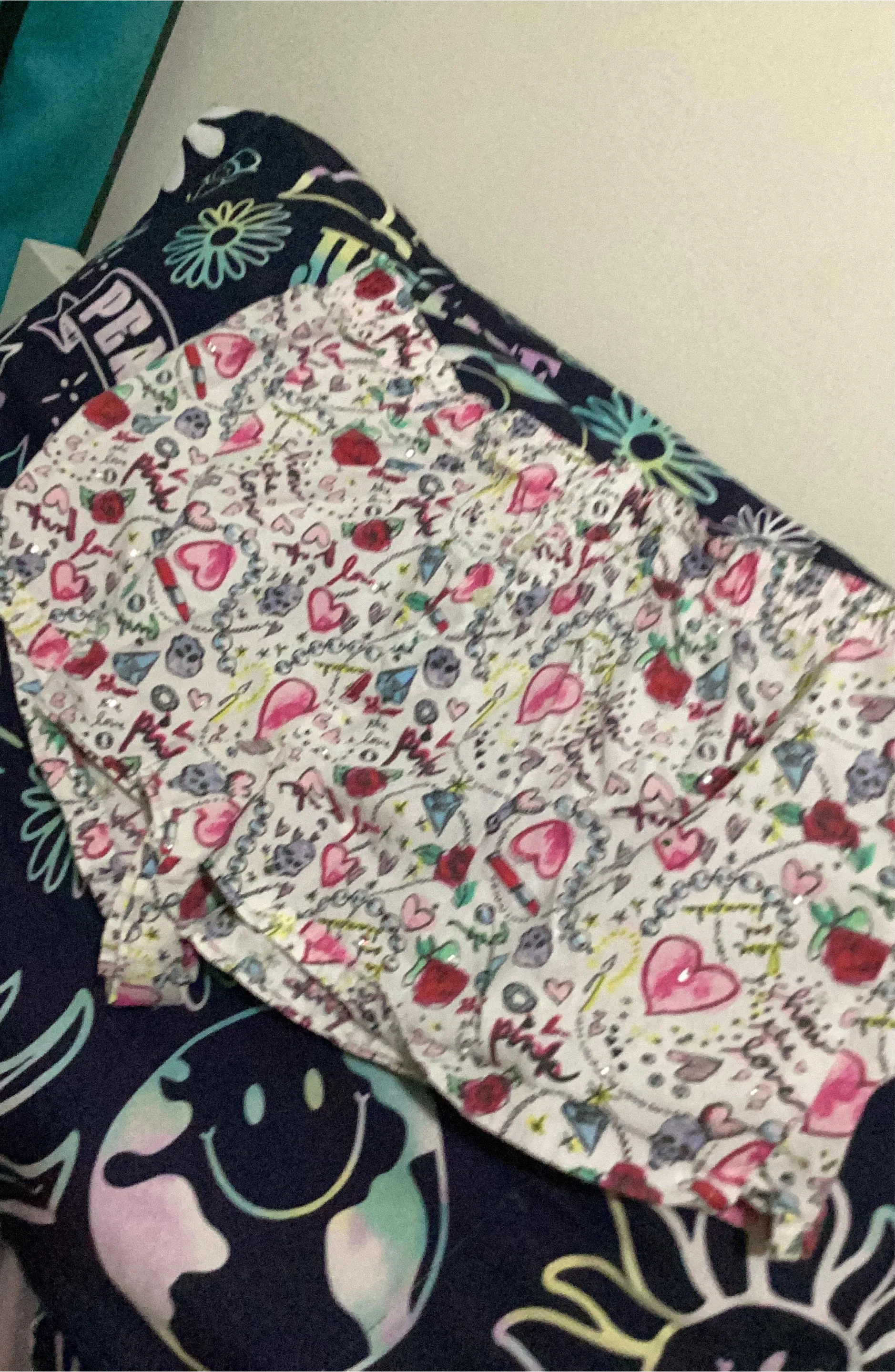 Comfy white pajama shorts featuring a playful all-over print of pink hearts, red roses, and scattered text. Made from a soft fabric, they're perfect for lounging. Elastic waistband for a comfortable fit.