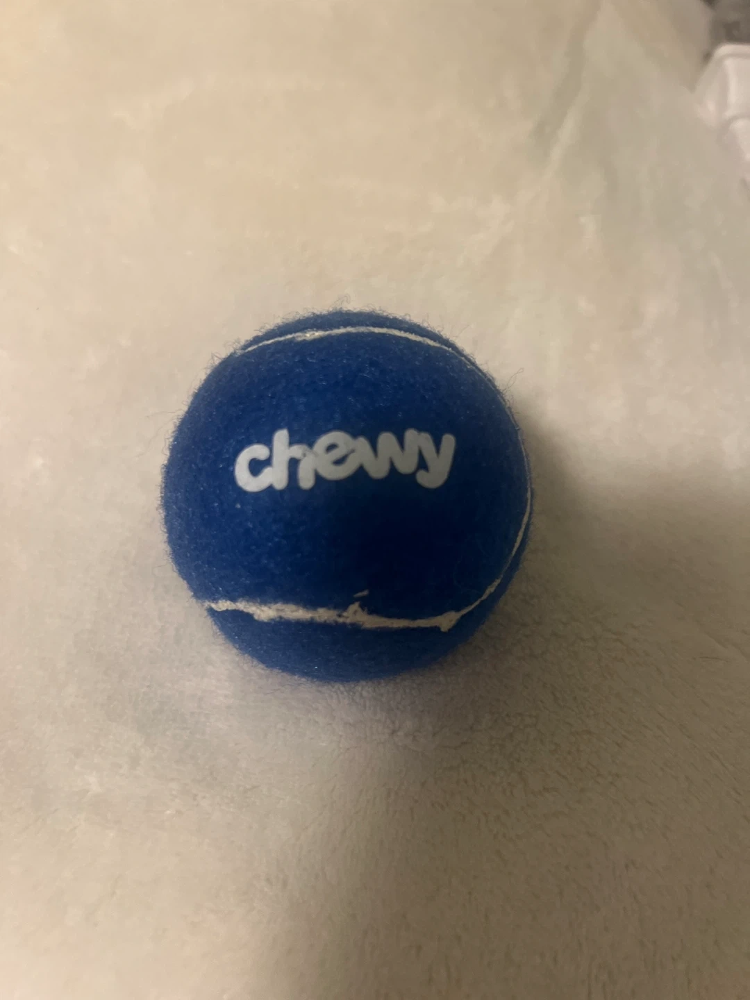 This is a blue tennis ball with "chewy" written on it. It's a standard size for pet play. It's great for fetch with your furry friend!