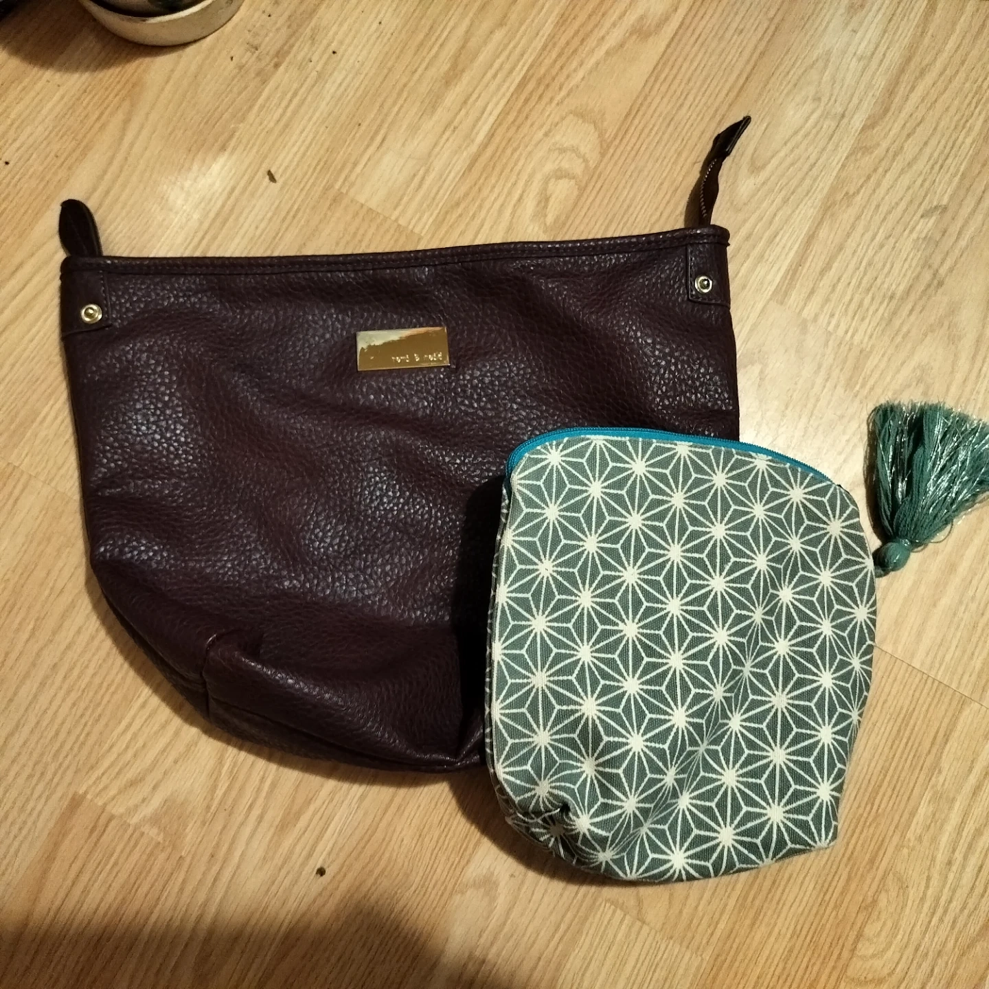 This set includes a burgundy faux leather bag with a gold accent plate. Zipper works great. Size: ~12"*10"*3"