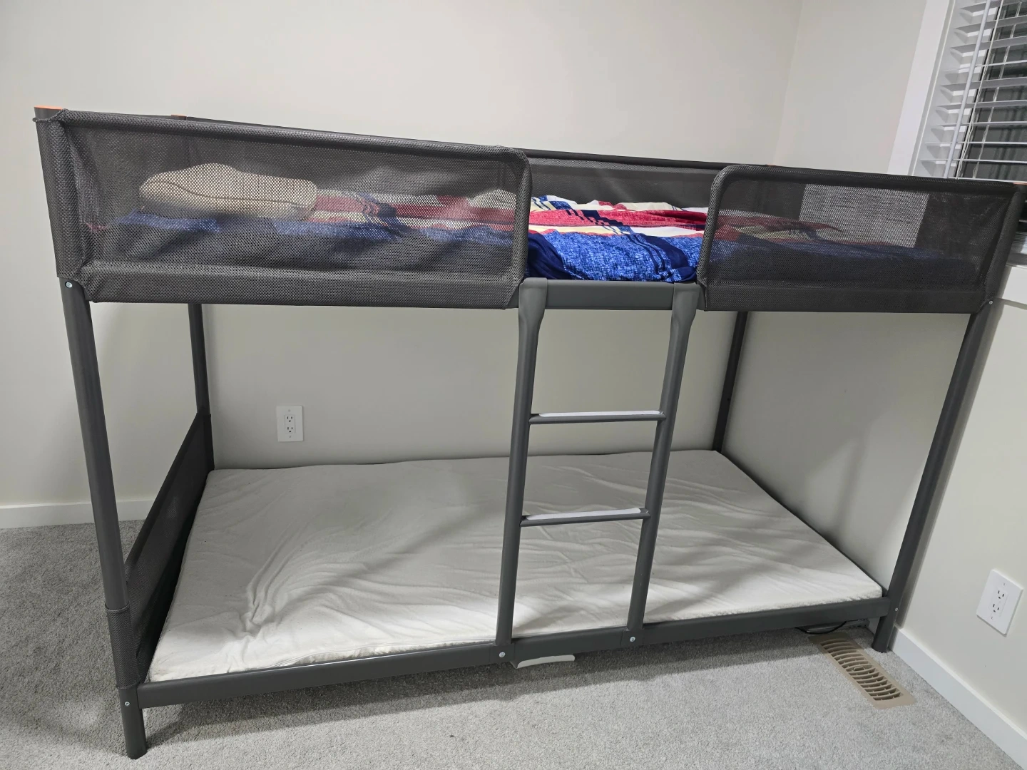 This is a grey IKEA bunk bed.It's great for maximizing space in a room!