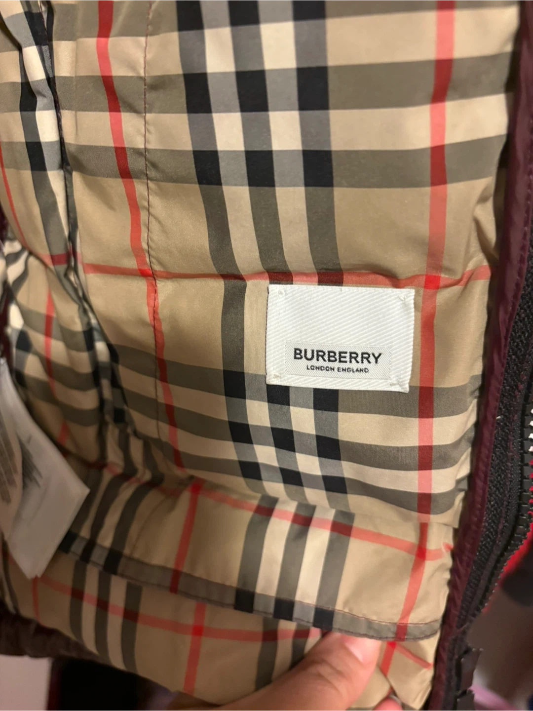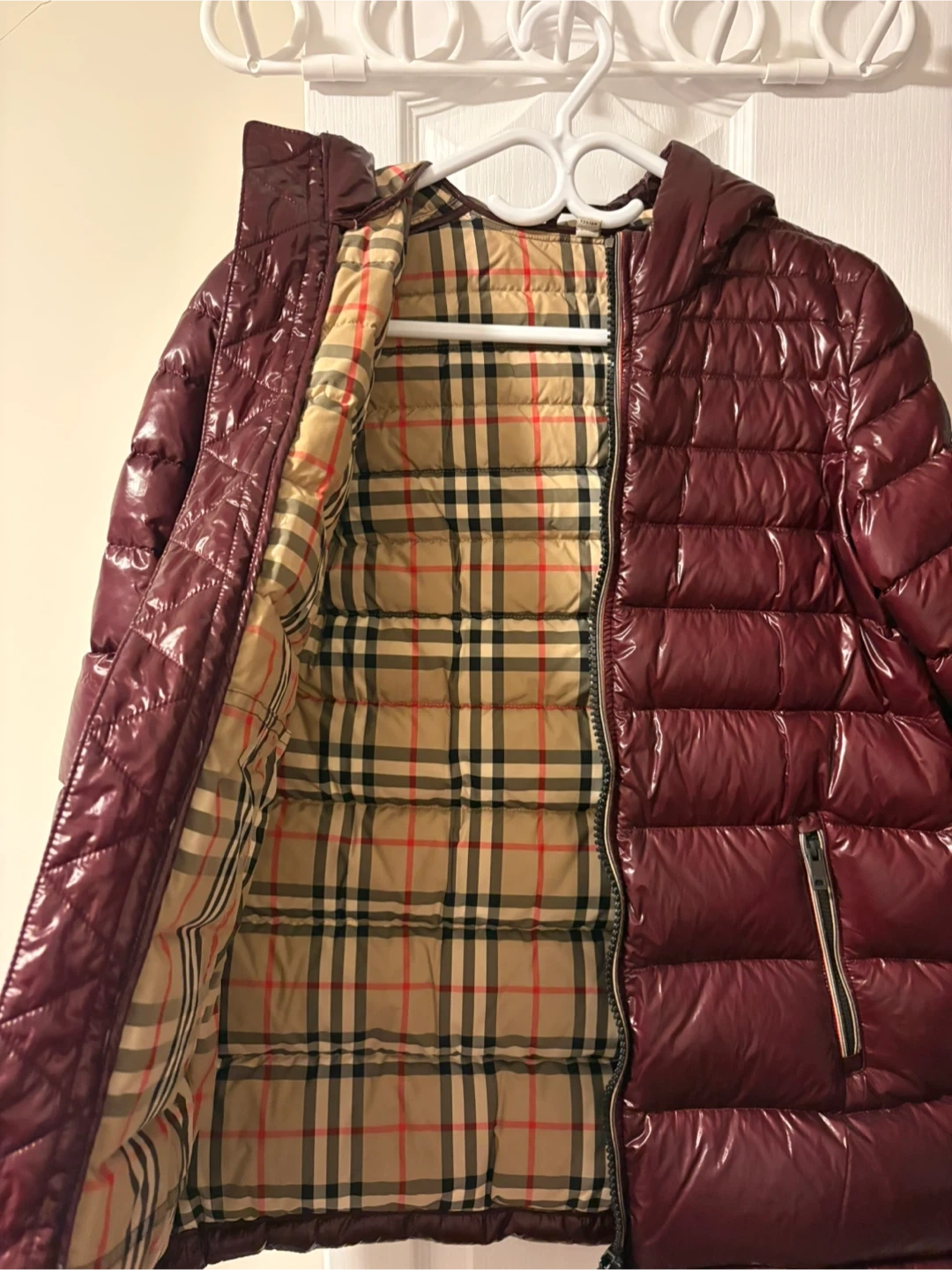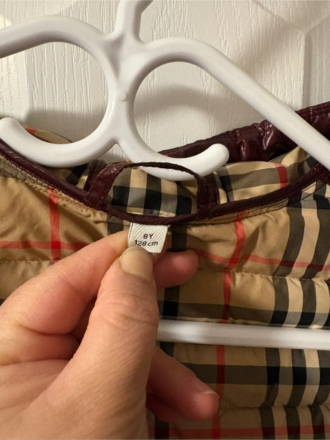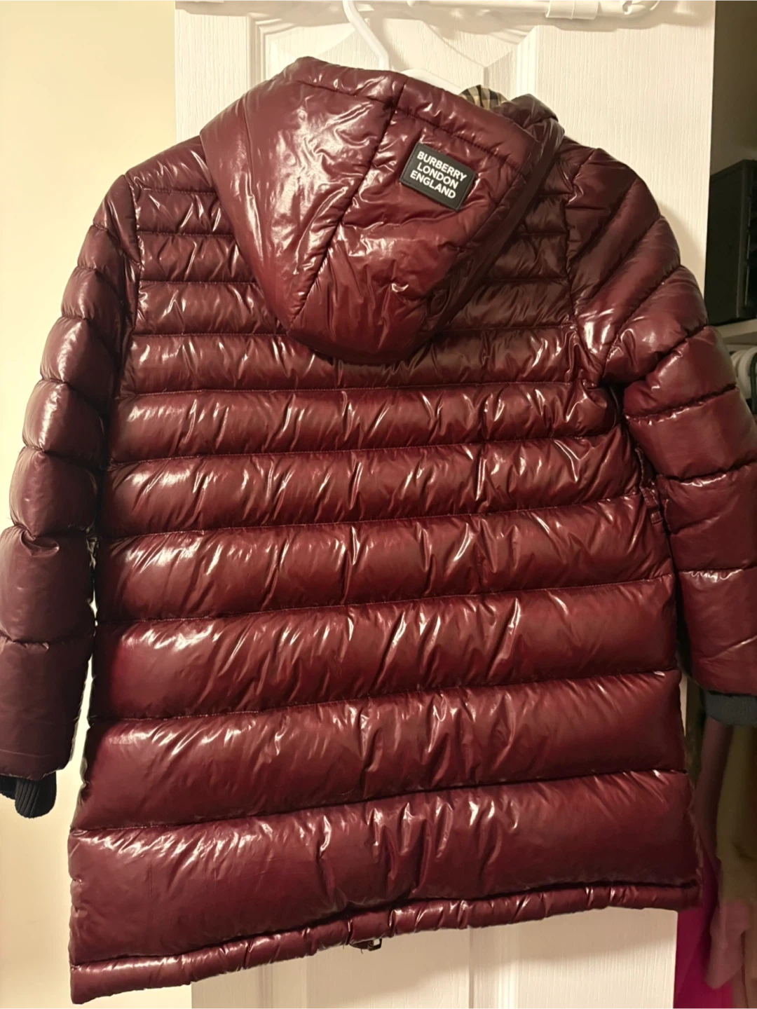 Burberry puffer jacket in burgundy with signature Nova Check lining. It's a reversible jacket, size 128cm. The outer shell is a glossy, water-resistant material. It comes with a hood.