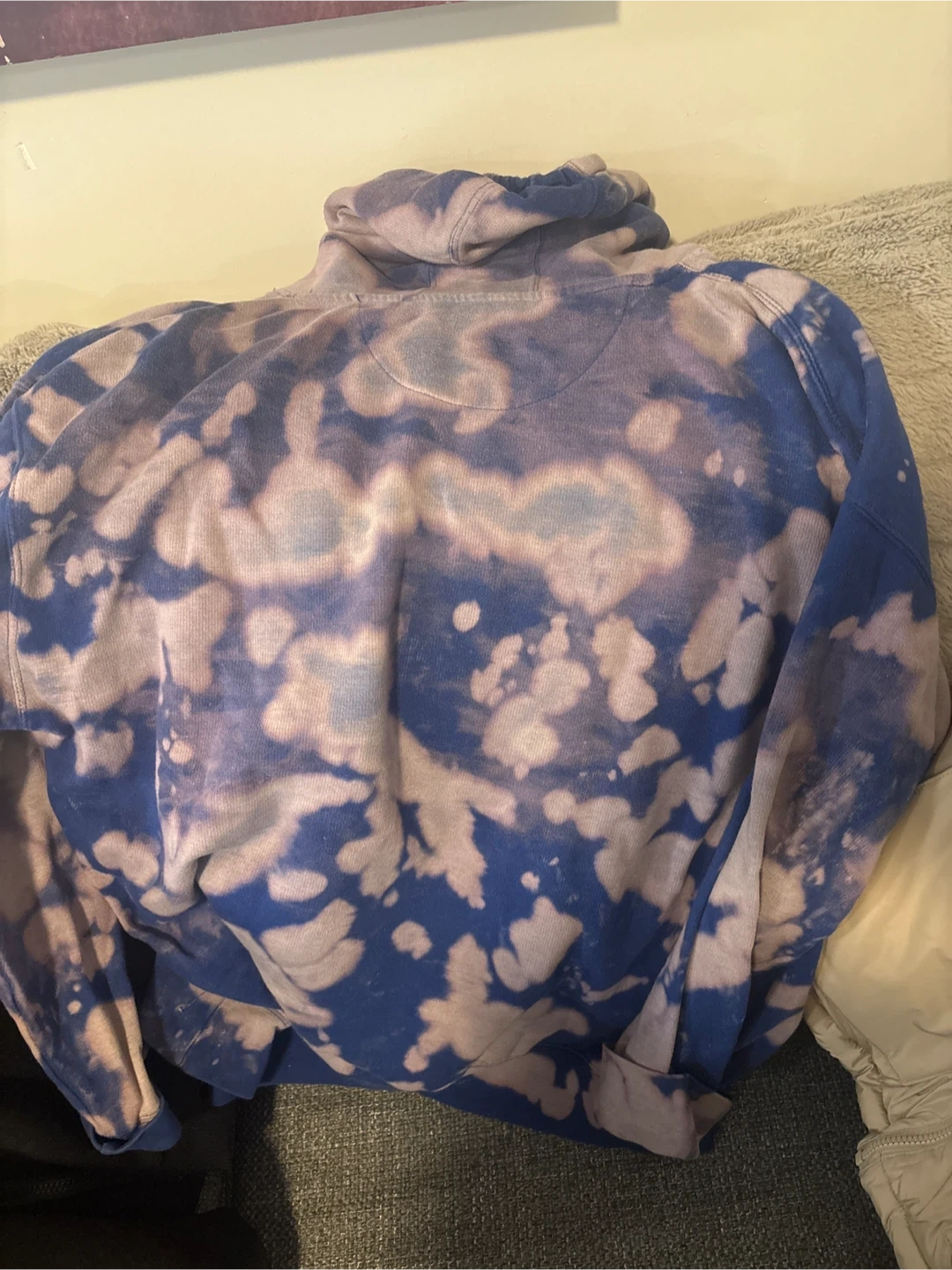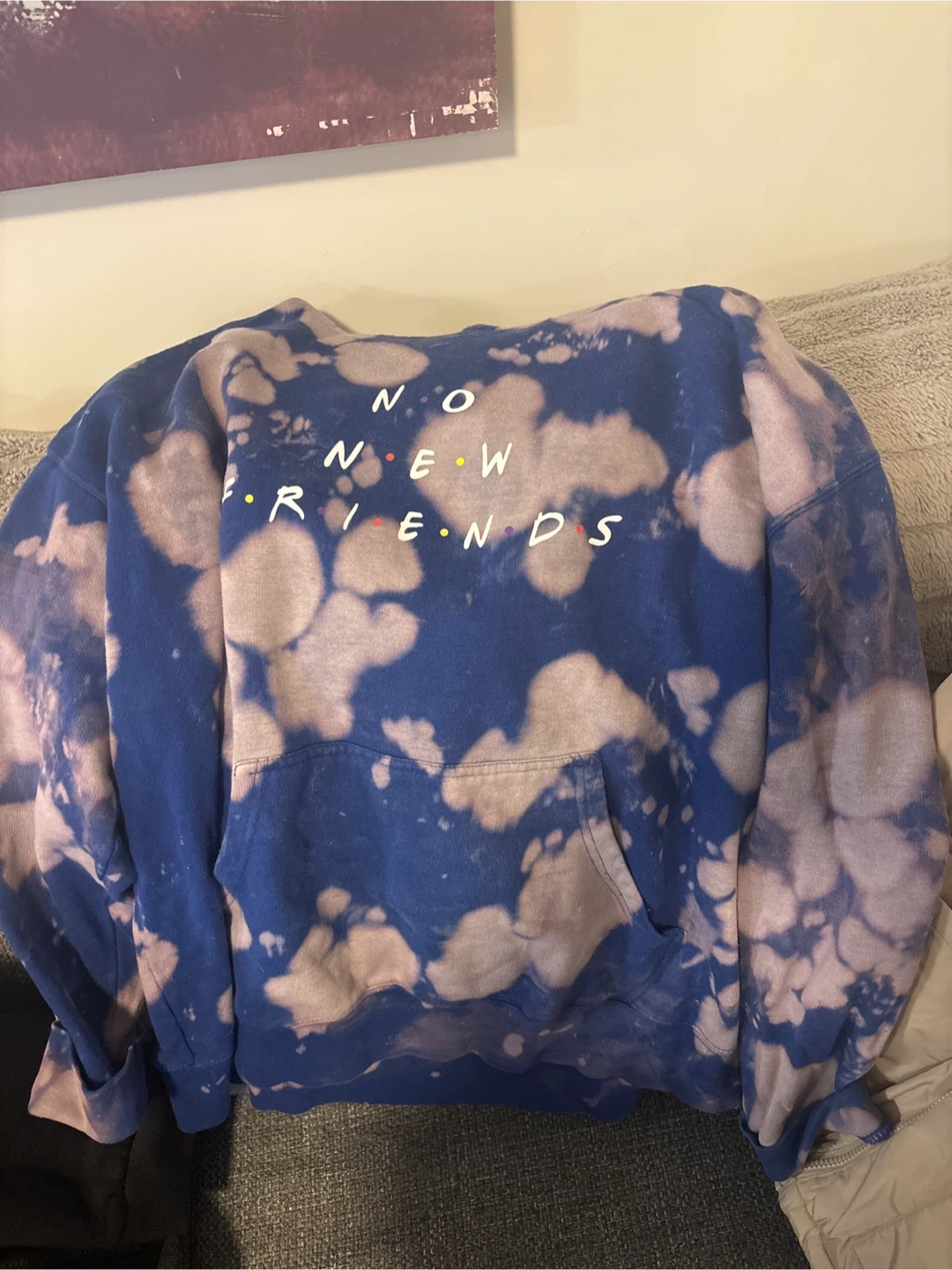 This is a bleached blue hoodie with "No New Friends" printed on the front. It features a kangaroo pocket and a drawstring hood. It's a unique piece with a tie-dye effect from the bleaching process.