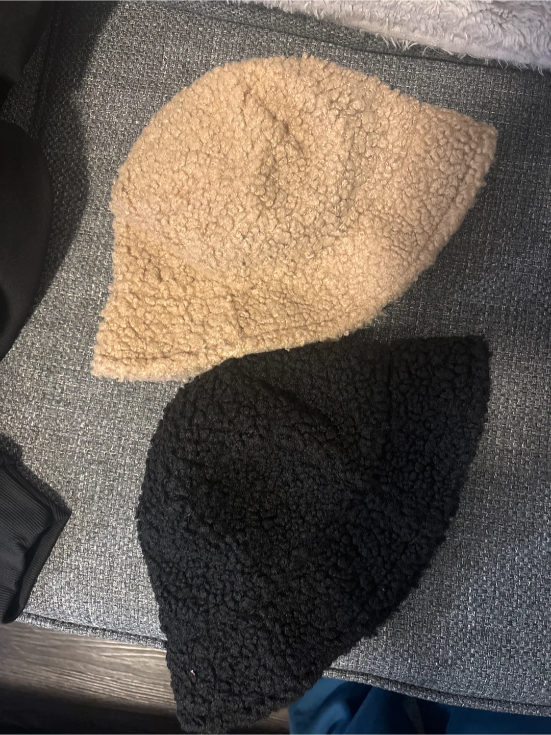 Includes one black and one tan sherpa bucket hat. These hats are made from a soft, fuzzy material. They're perfect for keeping warm and stylish!
