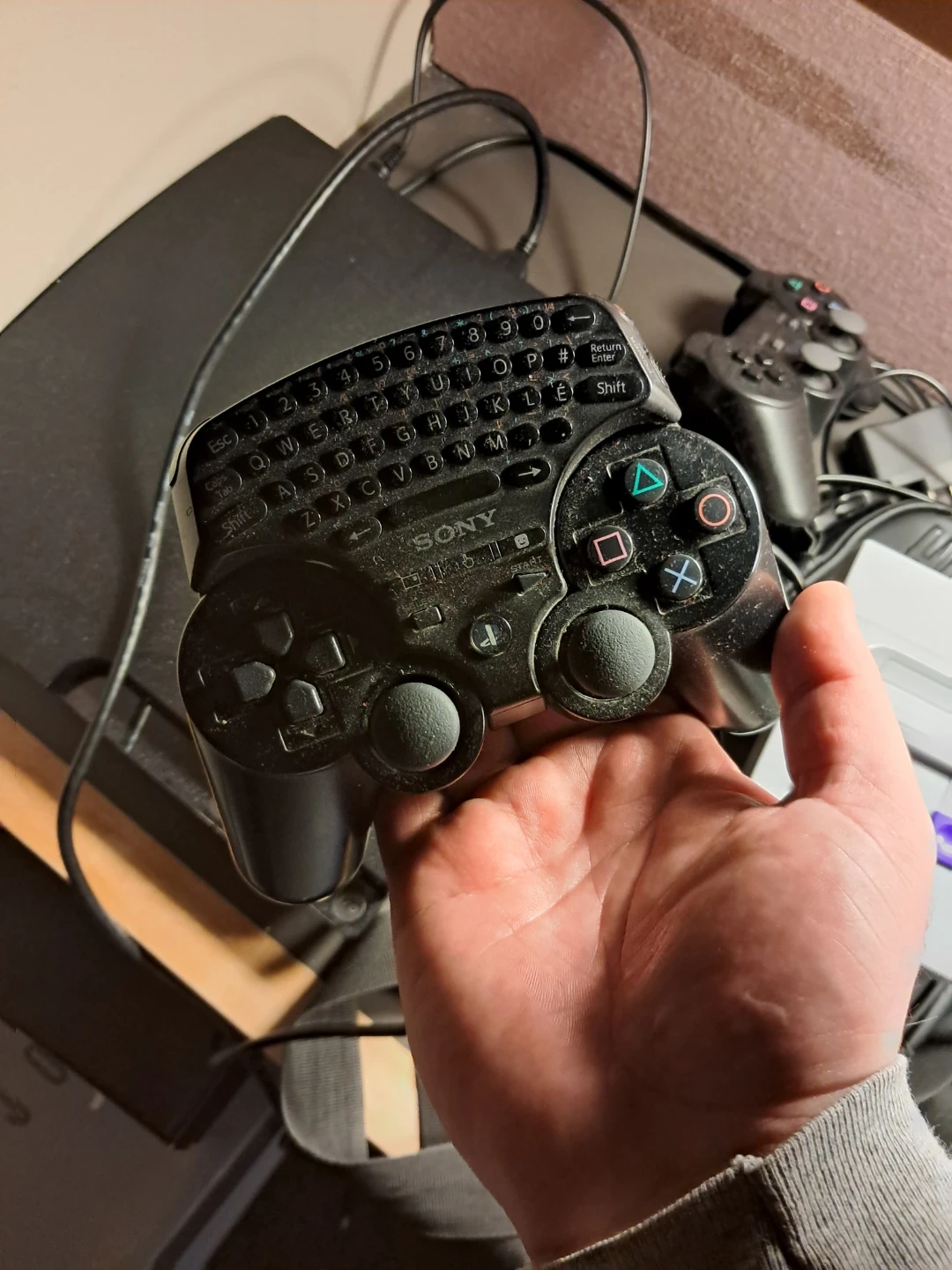 This is a Sony PlayStation 3 controller with an integrated QWERTY keyboard attachment. It's perfect for messaging friends or entering text in games. Controller is black. I have also added in a few games