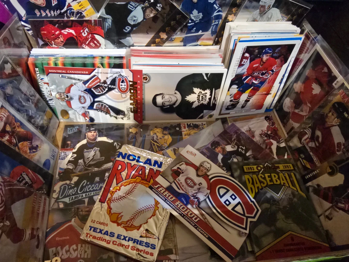 A collection of hockey and baseball trading cards is up for grabs. This lot includes various players and teams. They're great for collectors!