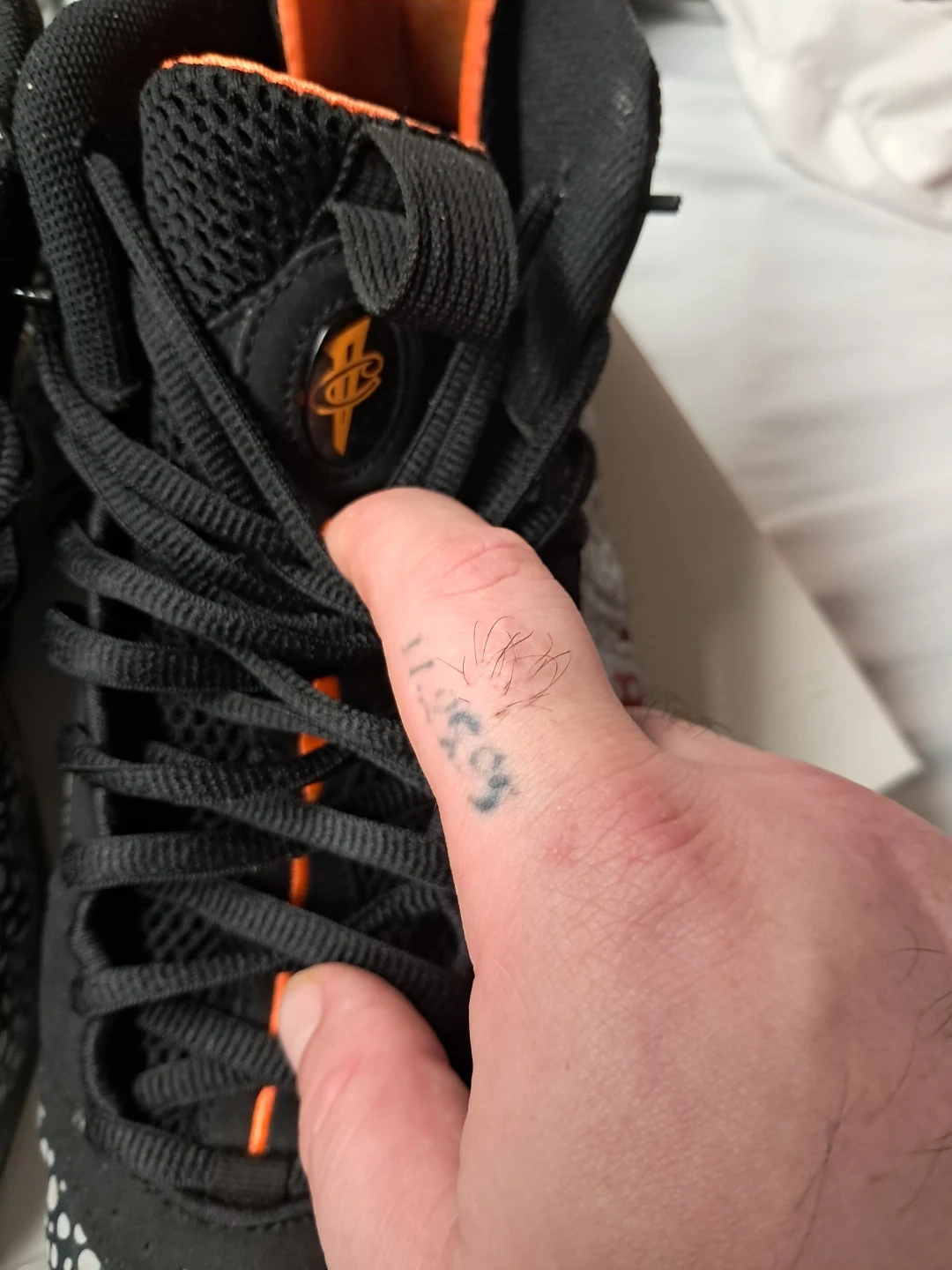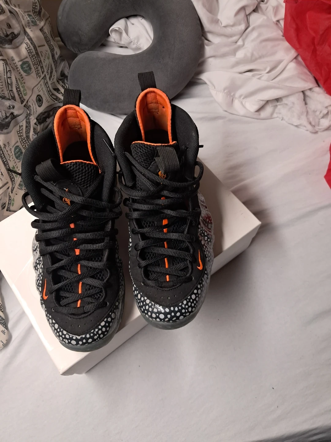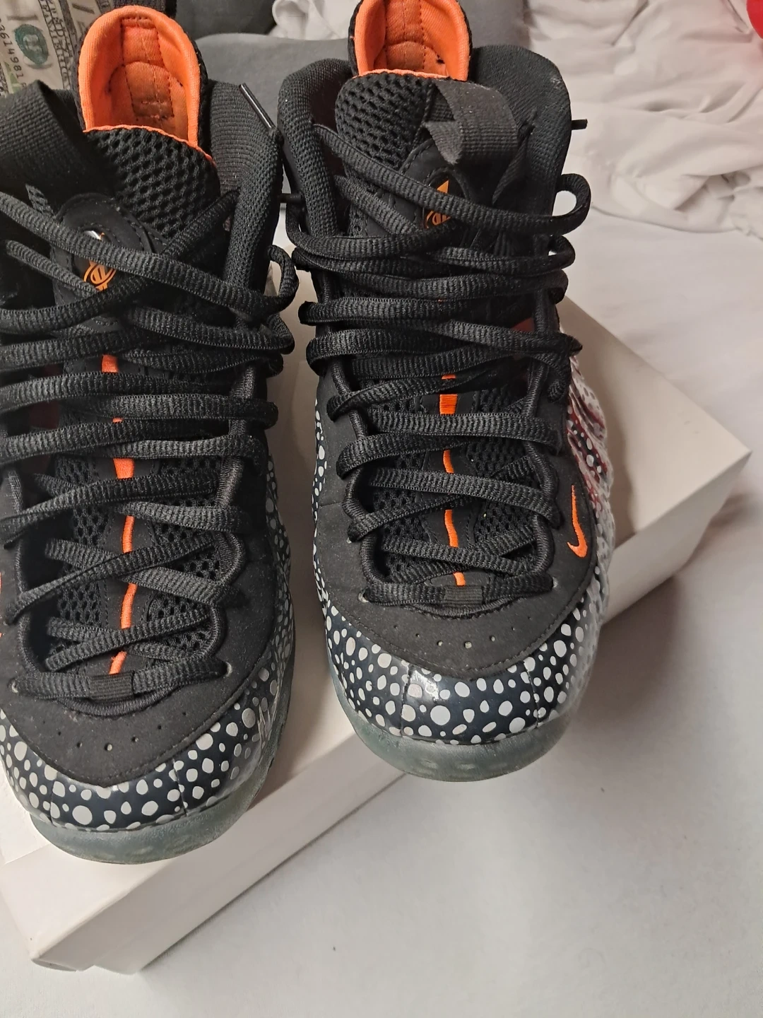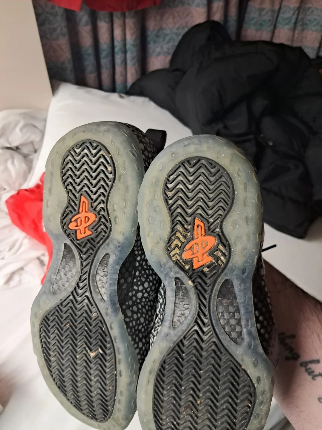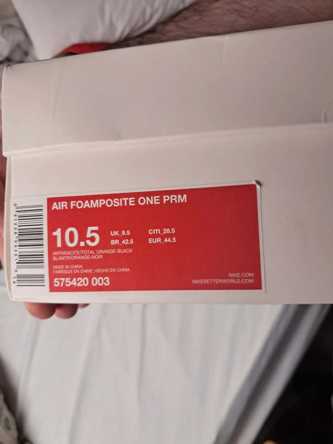 These Nike Air Foamposite One PRM sneakers come in a size 10.5. The colourway is Anthracite/Total Orange-Black with a distinctive speckled design on the lower shell. They're comfortable and stylish for everyday wear. Includes the original box!