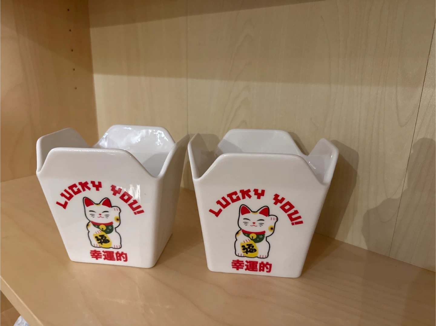 Two white ceramic containers designed like traditional takeout boxes. They feature a "Lucky You!" design with a Japanese Maneki Neko (beckoning cat) graphic.