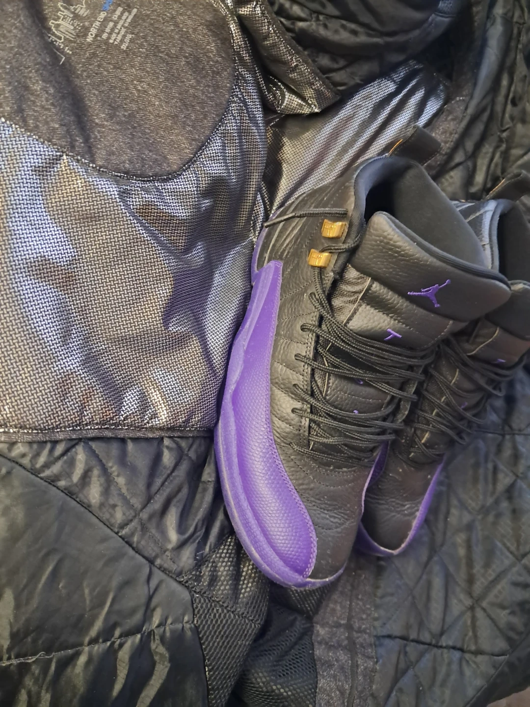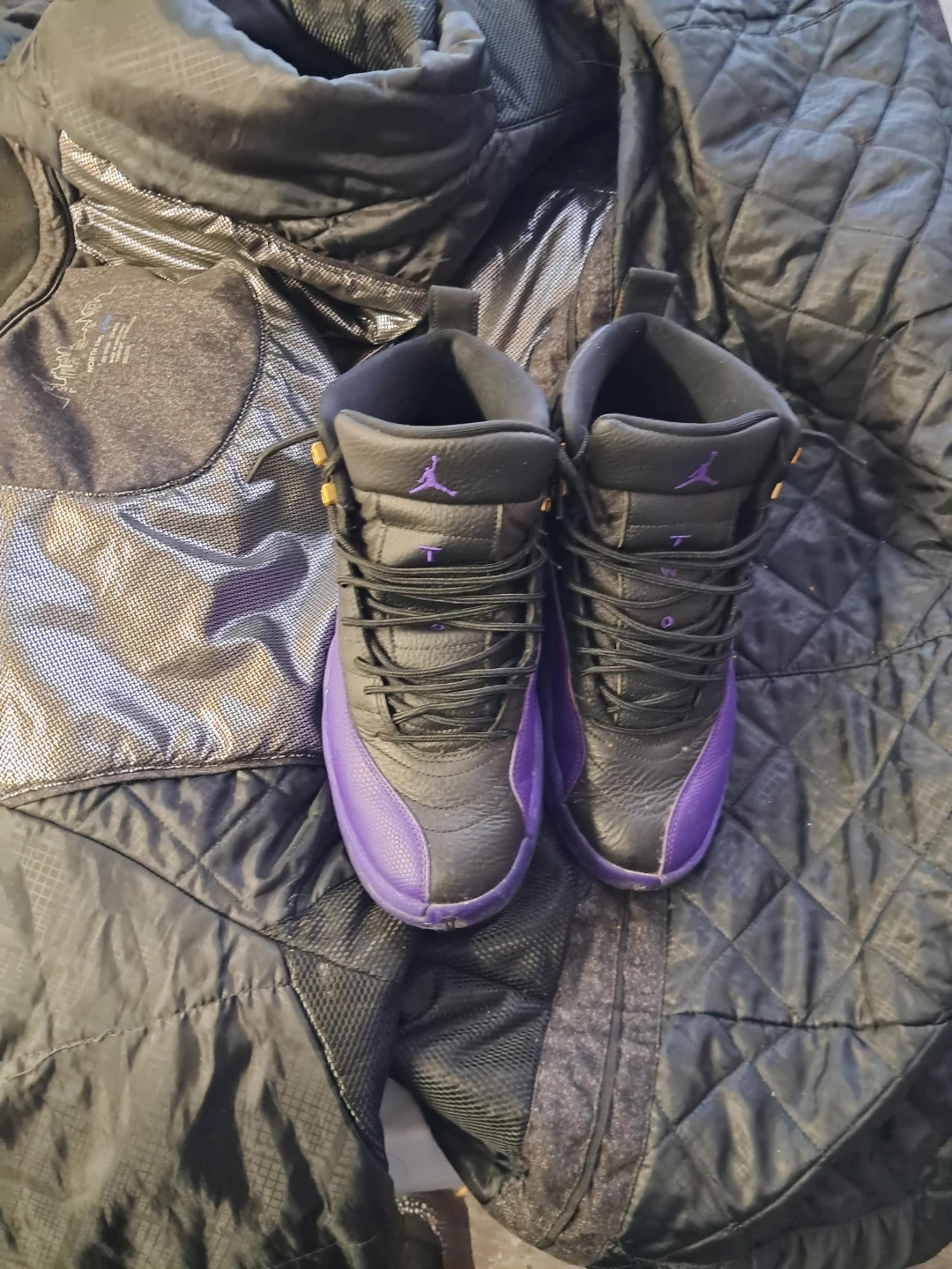 These are Air Jordan 12 Retro fried purple sneakers. Black leather uppers with purple accents. Lace-up closure. Includes original box. Great for collectors! Comes with og box