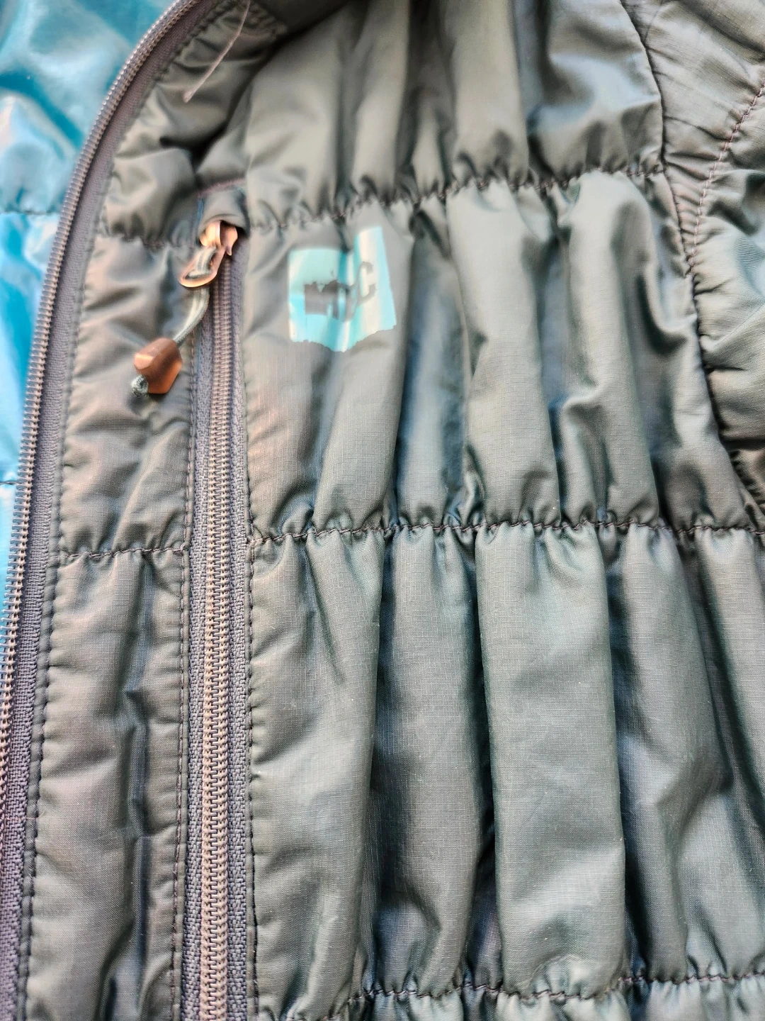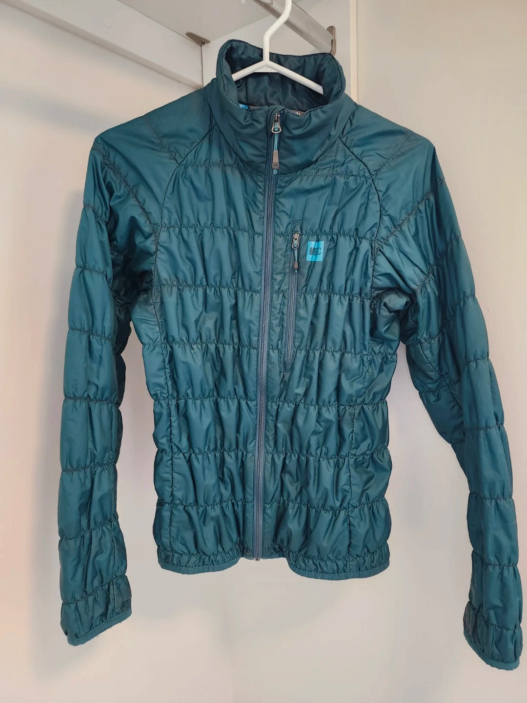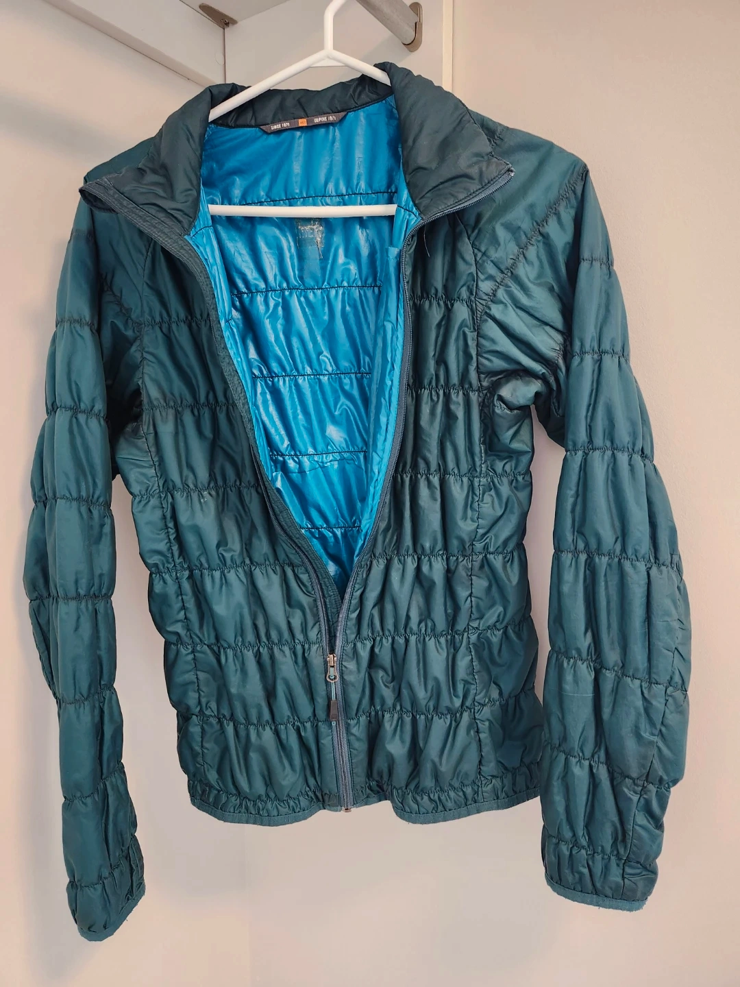 Lightweight, warm, and water-resistant. Perfect condition, no defects. Great for spring and fall weather, hikes and walks, travel, etc. Flattering fit with sideways stretch. One zippered pocket.