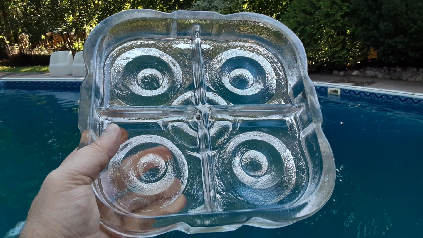 Measuring 2" tall and 9" wide, with each divided section approximately 4.5" x 4.5", the dish weighs in at over 5 lbs., and is in perfect vintage condition.
