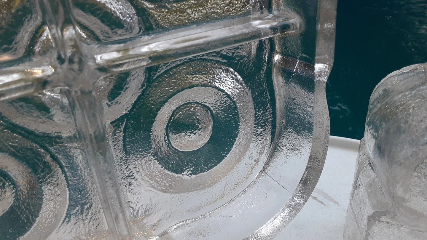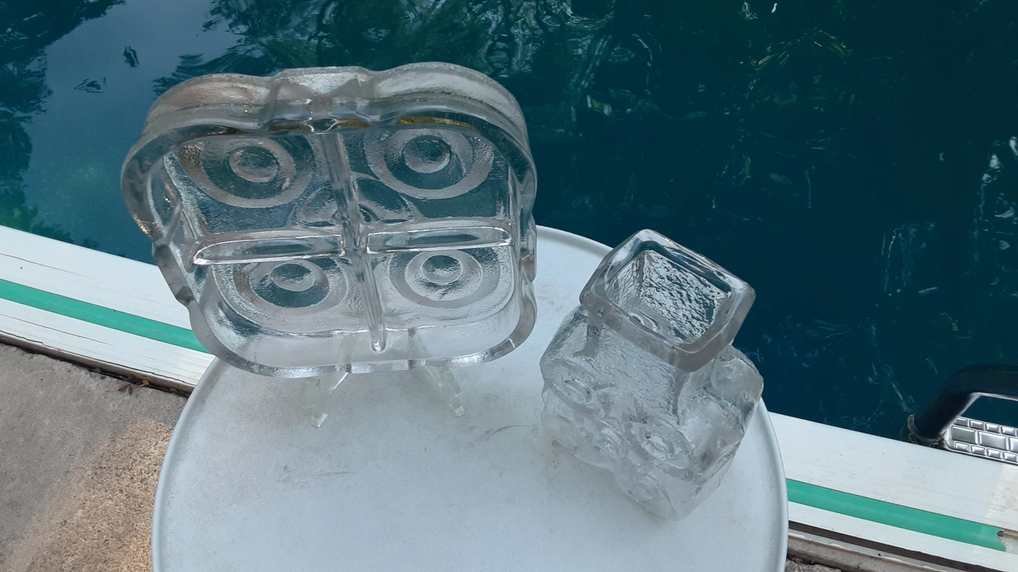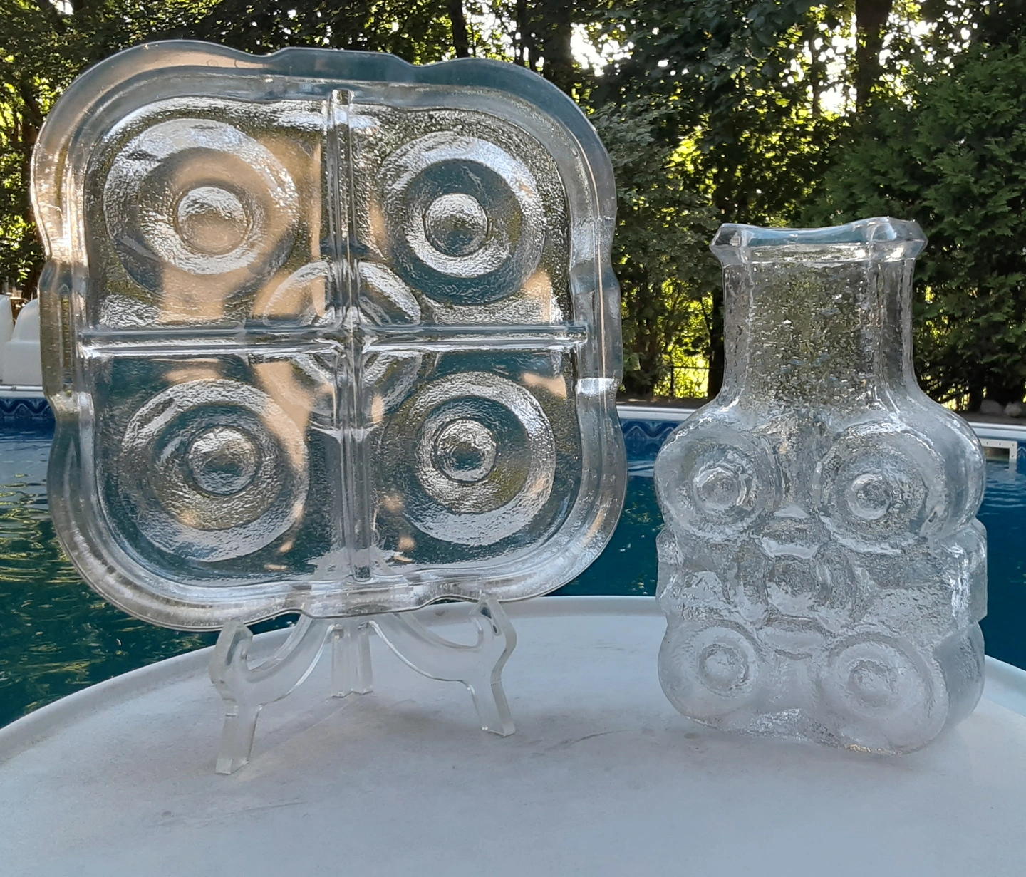 Hey there vintage collectors! We've got a real treat for you - a breathtakingly beautiful art glass set from the 1970s designed by none other than Lars Hellsten for Walther Glas Design. Entitled "On the Rocks" this set includes a heavy and thick divided dish and a flower vase, both of which are true works of art beyond just their function. The mid-century, brutalist design is a testament to Hellsten's prowess as a designer, and his work with Orrefors and Skruf Sweden is widely known and admired.