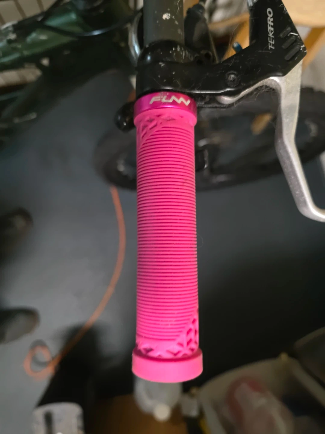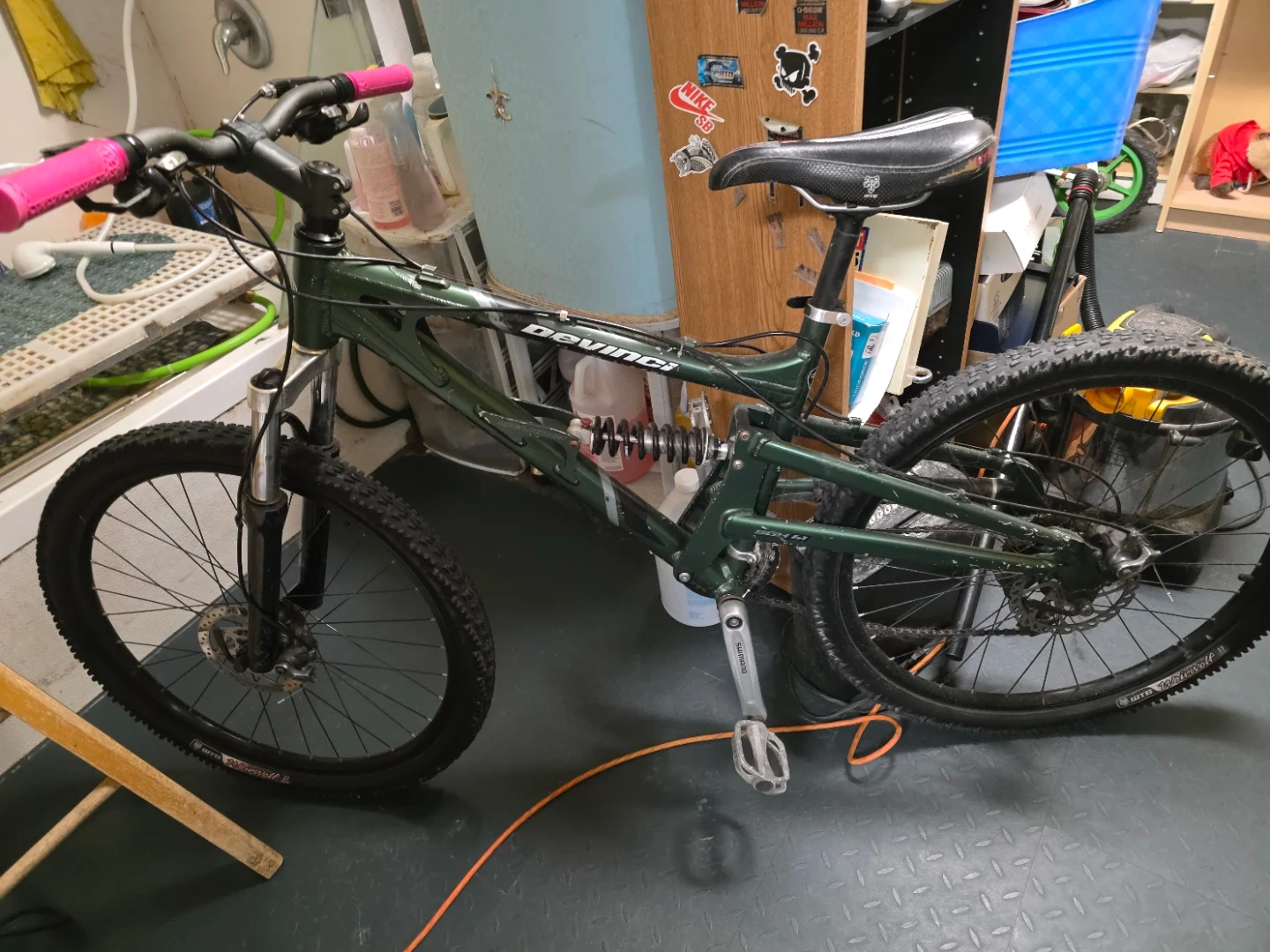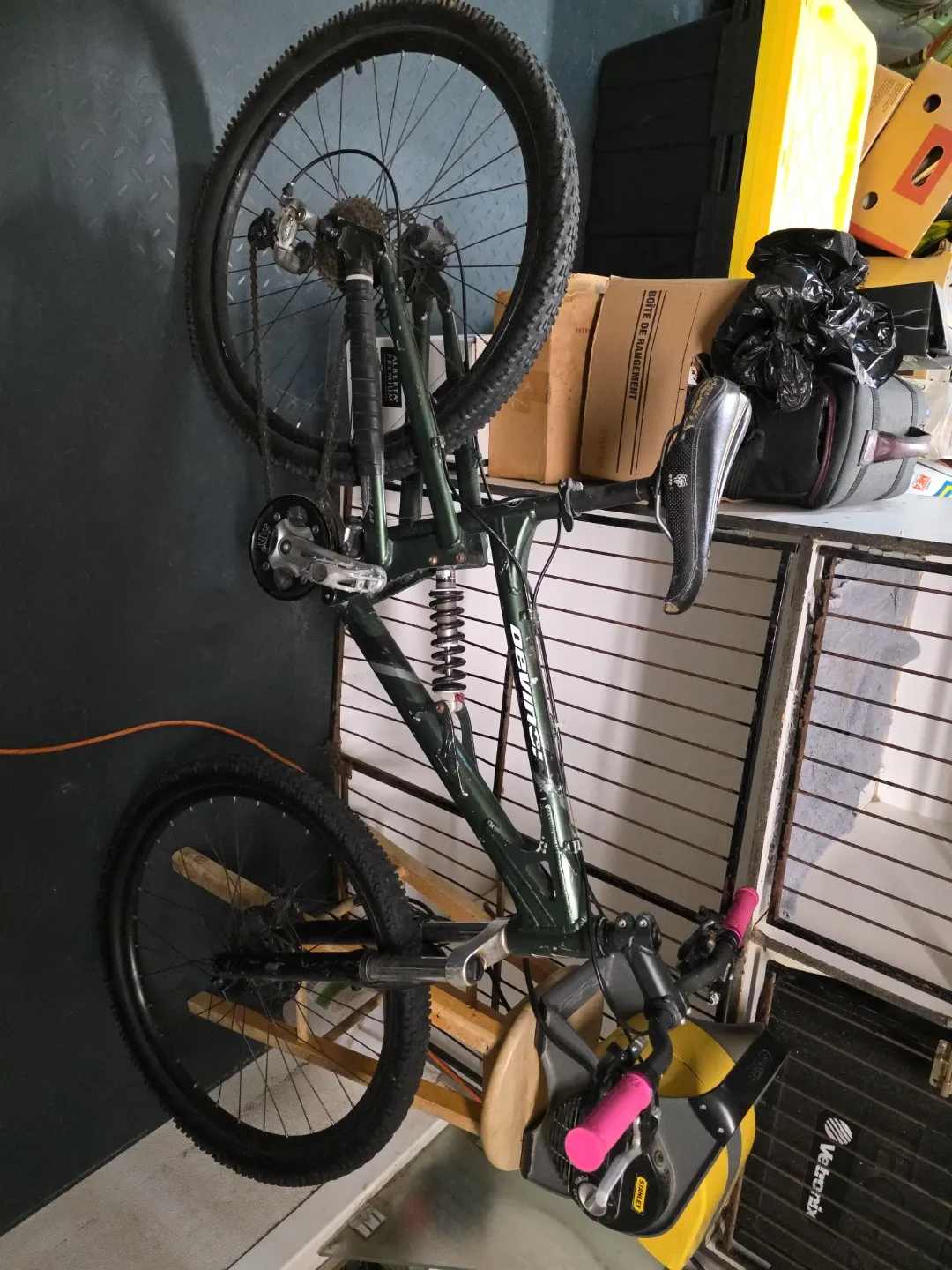 Green full suspension mountain bike with bright pink grips. Features disc brakes and a rear shock absorber. Great for trails and off-road riding!