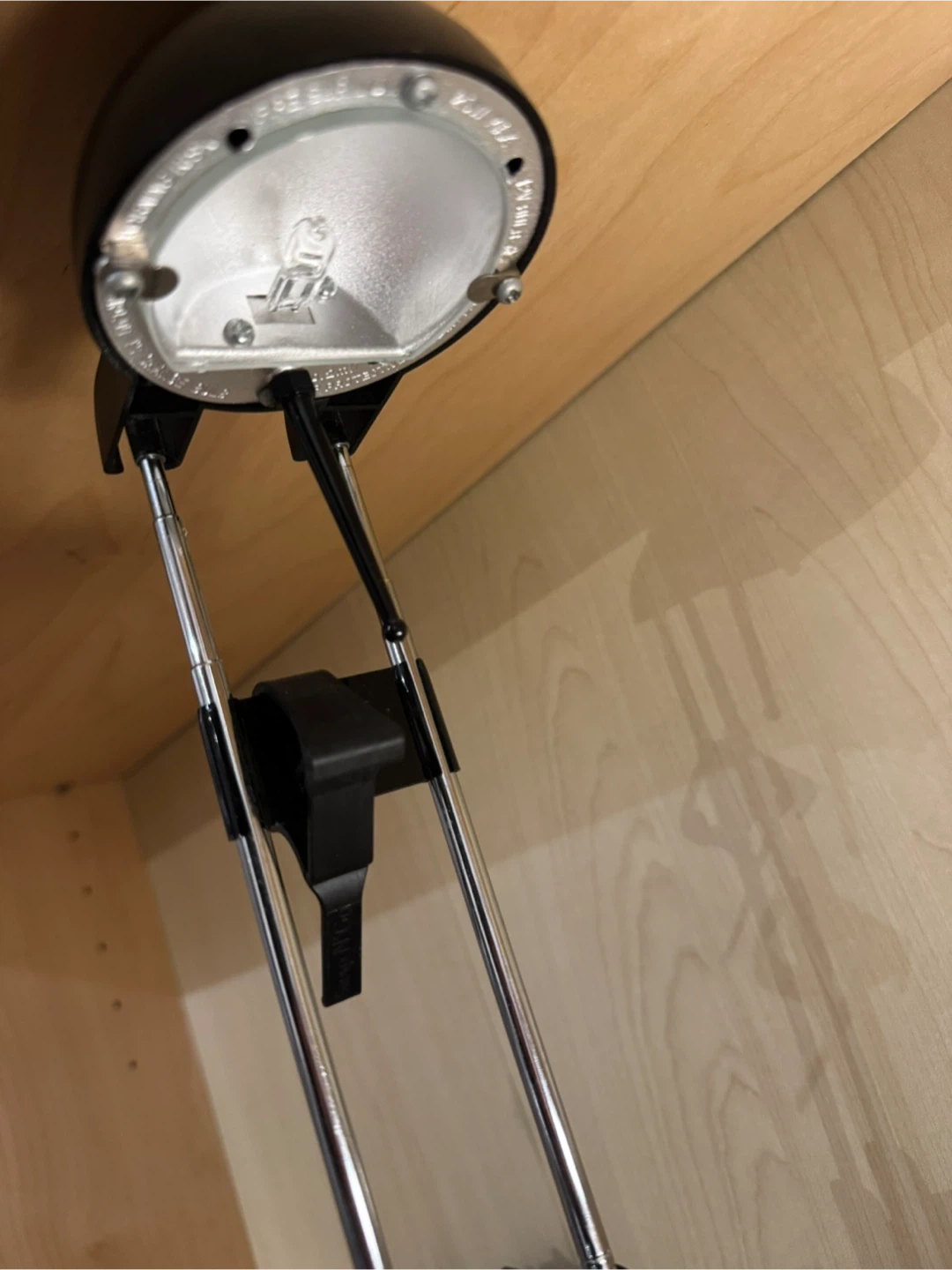 This is a black adjustable desk lamp. It's made of plastic and metal. It has a flexible gooseneck arm for positioning the light where you need it. It's great for tasks requiring focused light.