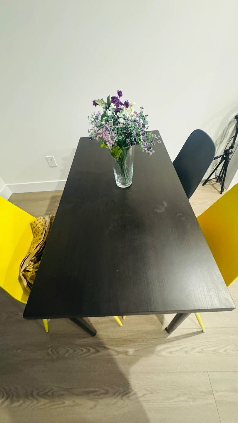 A dark wood ikea office desk with four legs. It's suitable for a dining room or for office or kitchen. Seats up to four people. 47 inches length