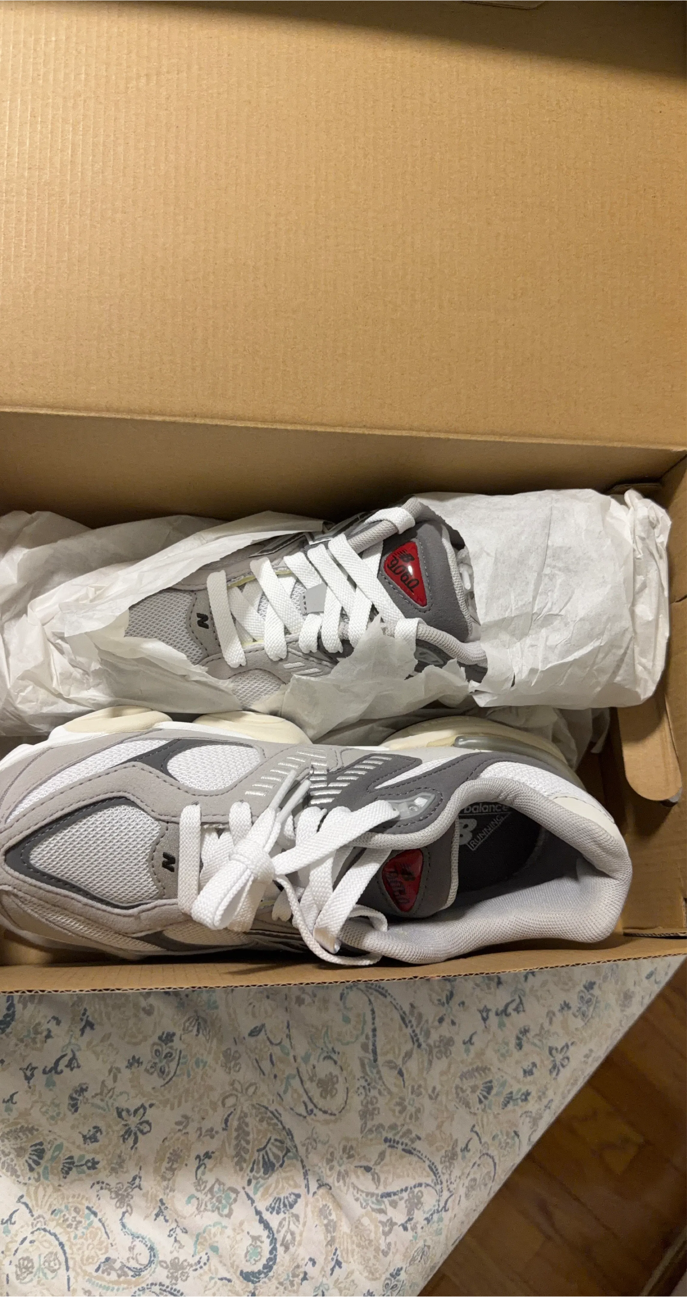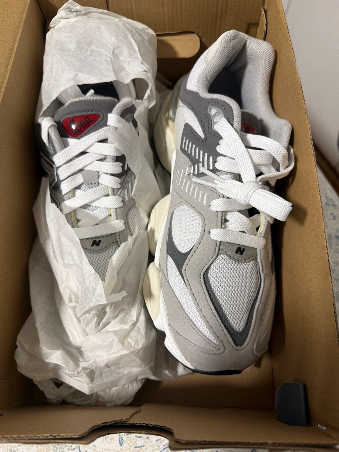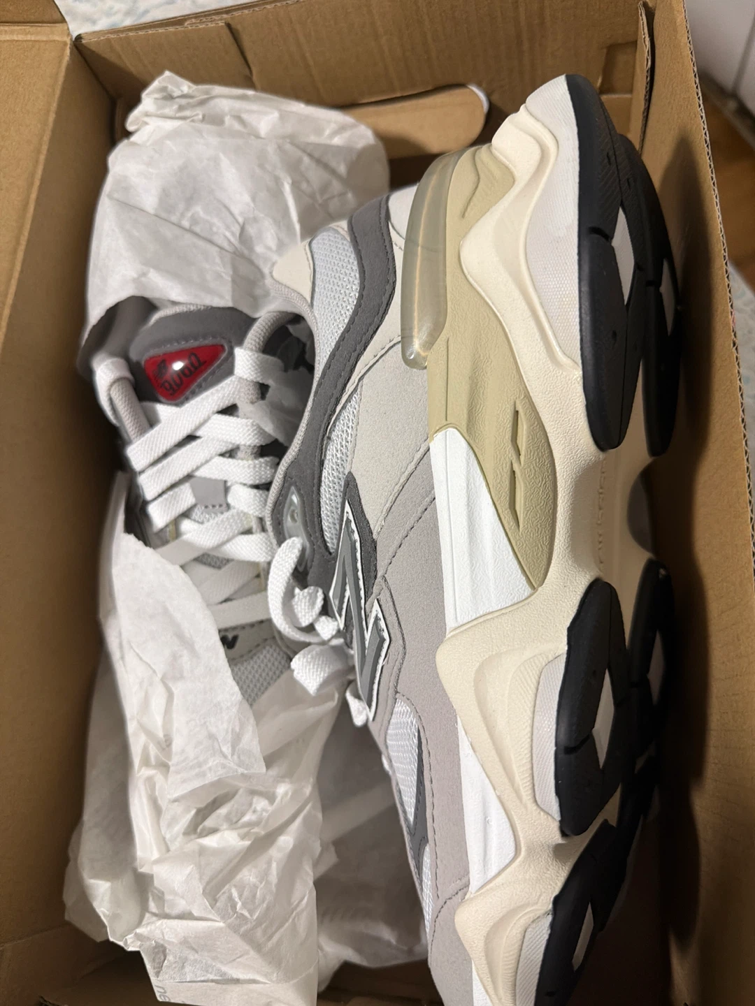 New Balance 990 V6 running shoes in grey. These sneakers are in their original box, wrapped in tissue paper. They feature a mesh and suede upper with a chunky sole.