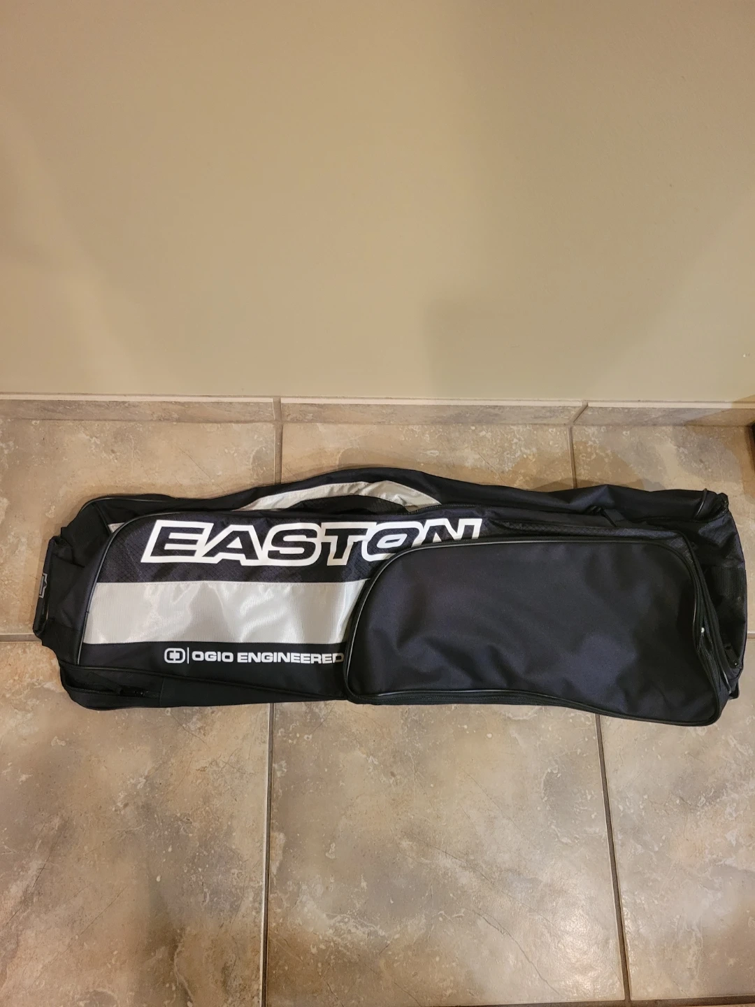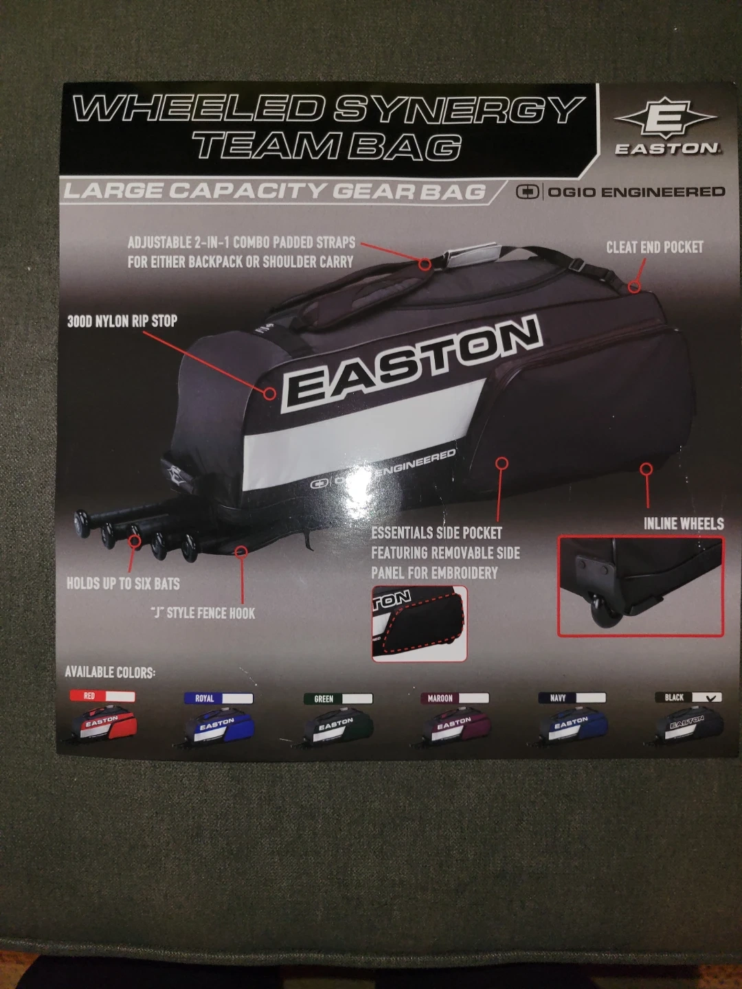 This is an Easton Wheeled Synergy Team Bag, a large capacity gear bag for baseball or softball equipment.