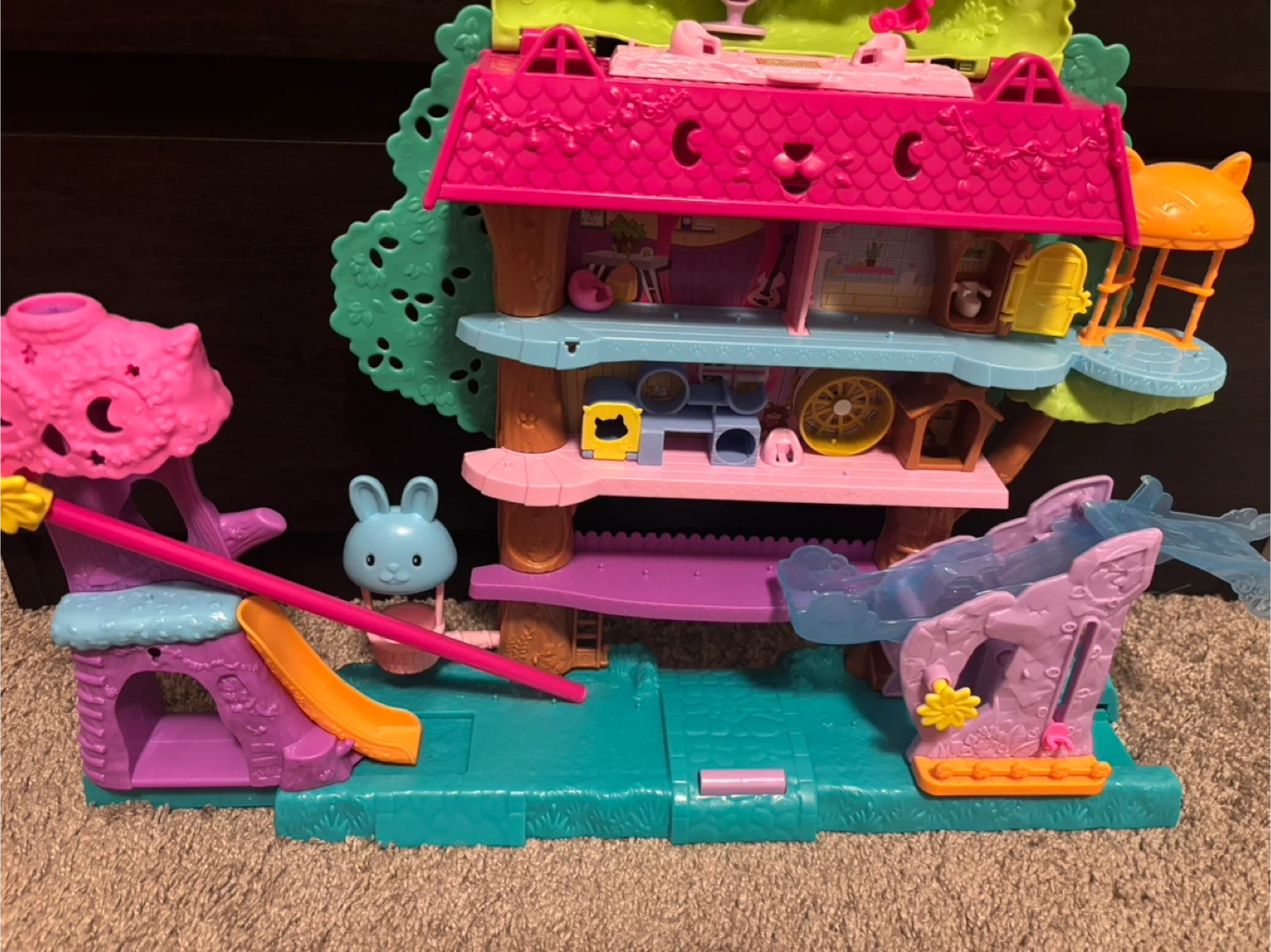 This Polly Pocket playset features a lovely mansion theme. It includes a horse-shaped compact, a playset, and a bag of accessories.