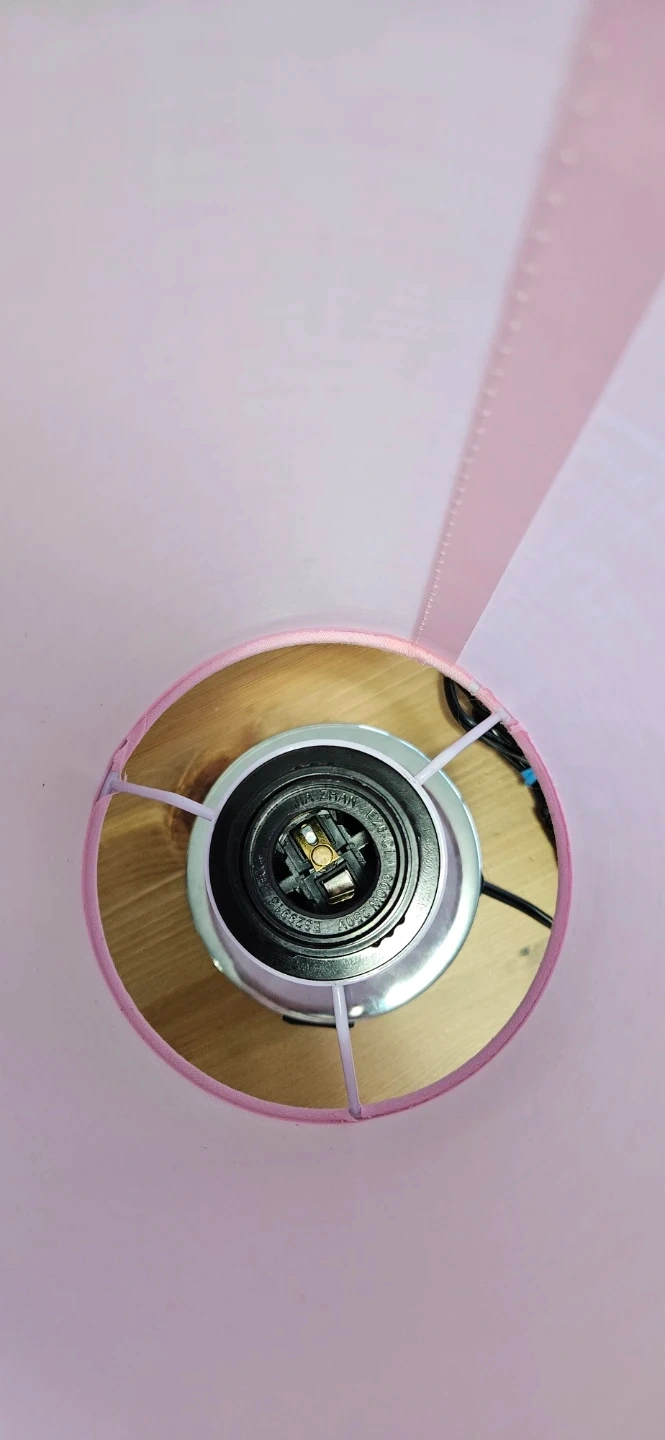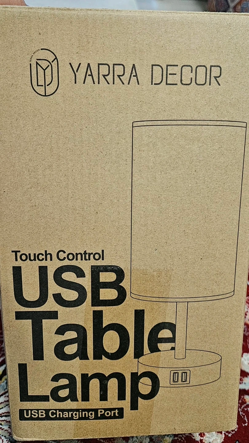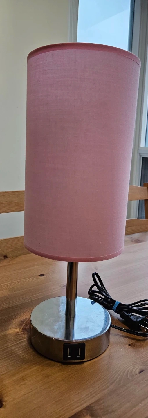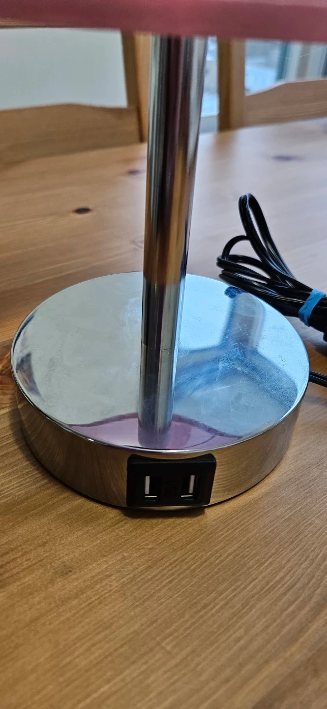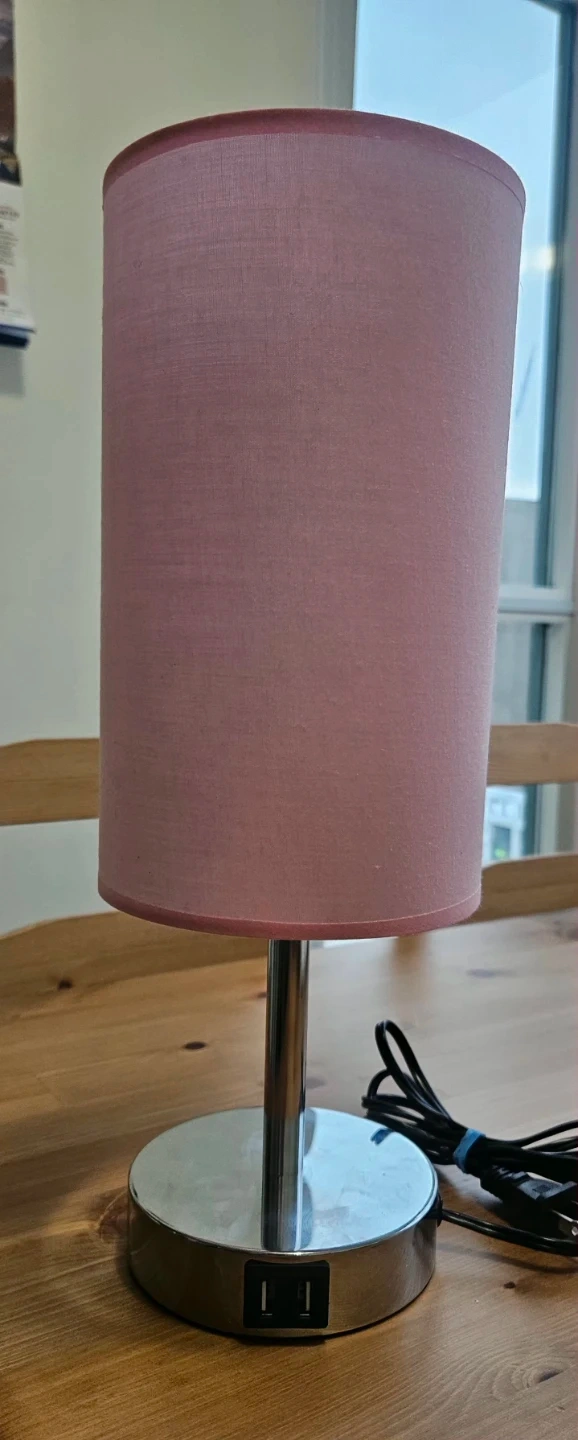 This Yarra Decor table lamp features touch control and USB charging ports on its base. It has a pink fabric shade and a chrome finish. Perfect for a bedside table or desk!