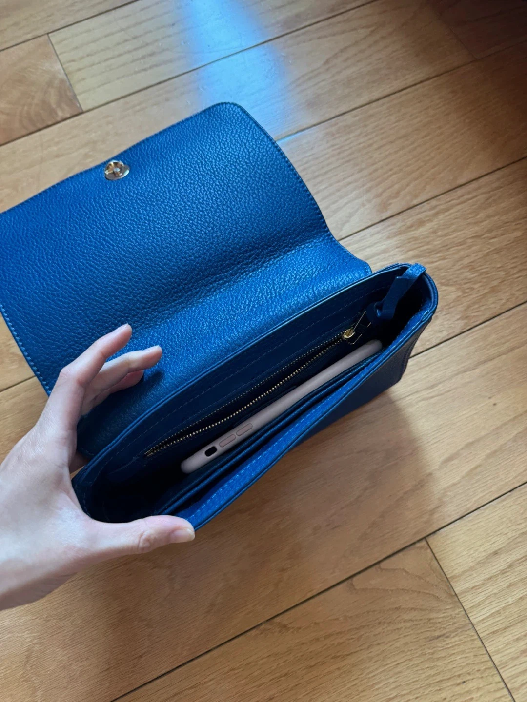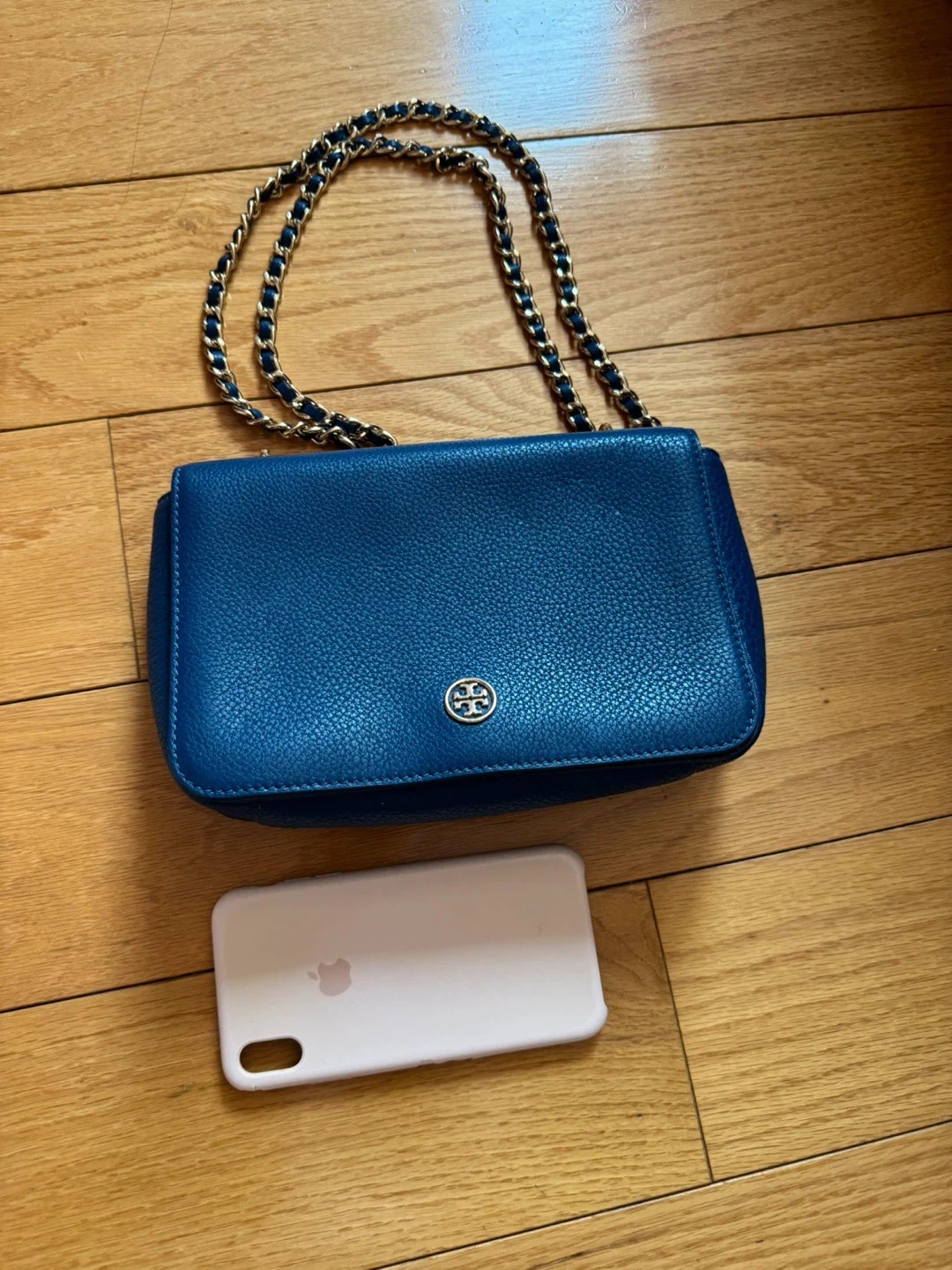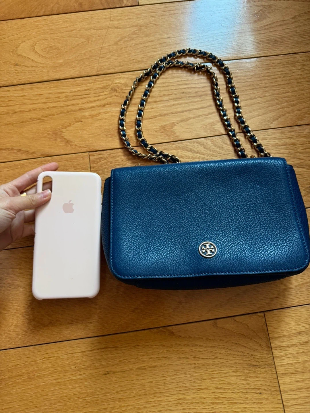 Beautiful Tory Burch wallet in a deep blue pebbled leather. It features the iconic Tory Burch logo and a gold chain strap. Leather material.