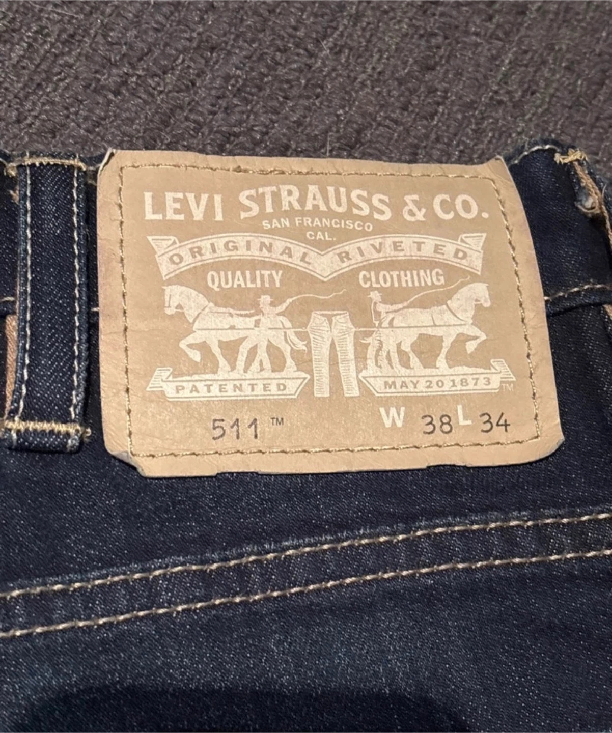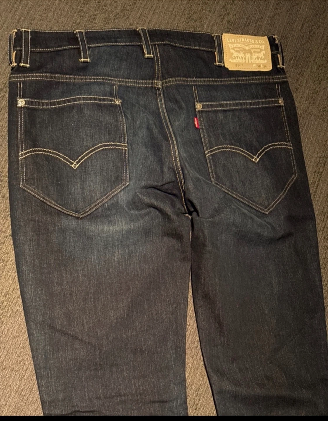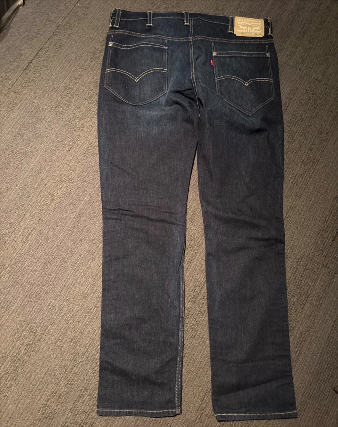 These are a used pair of Levi's 511 jeans in a size 38x34, offering a slim fit with a bit of room to move. They're in good condition. The classic dark wash makes them versatile for different styles.