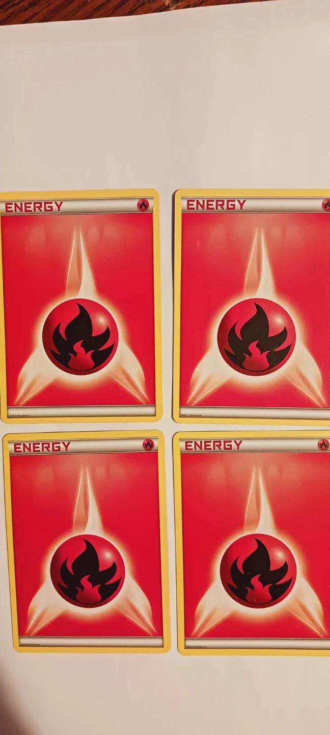 Four Pokemon Fire Energy cards are included. These are standard size trading cards. They're perfect for building your Pokemon deck!