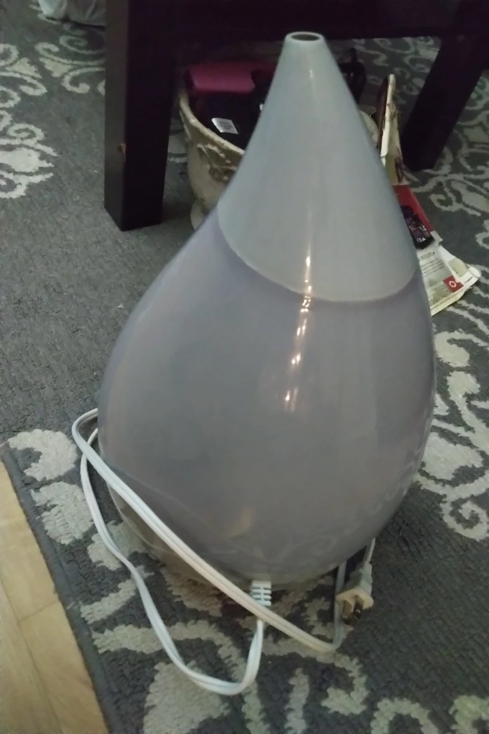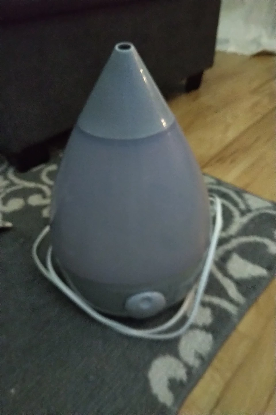 This teardrop-shaped humidifier is grey with a light grey top. It has a simple on/off dial at the base. It's a nice way to add moisture to the air.
