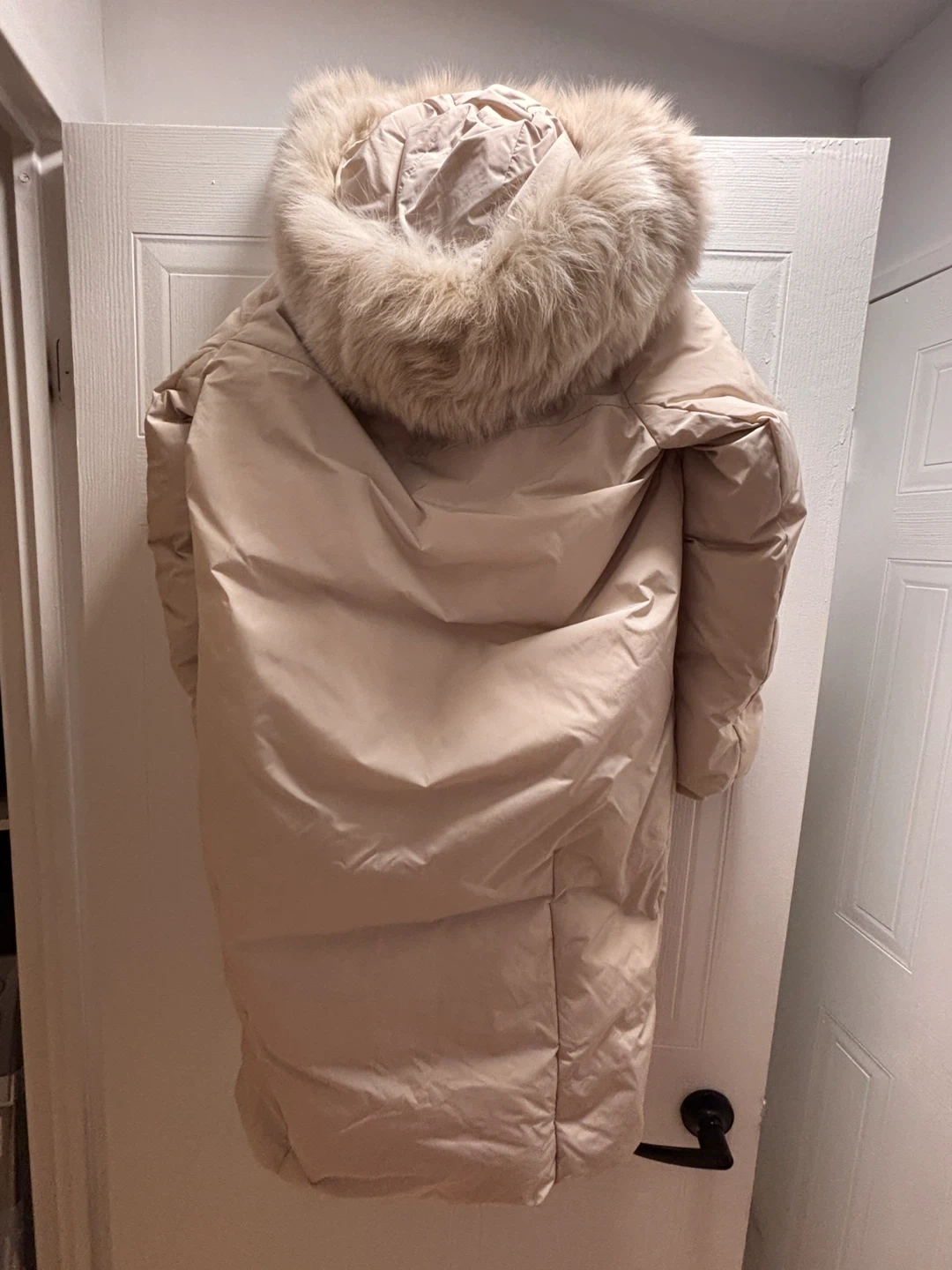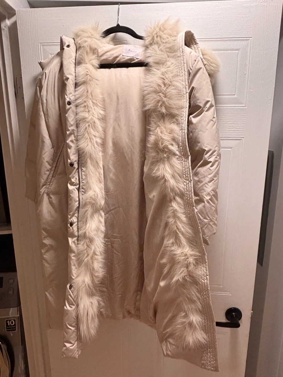 This is a Mayonez women's long puffer coat in a light beige colour. It features a detachable faux fur trim on the hood. It's a stylish and warm option for colder weather.