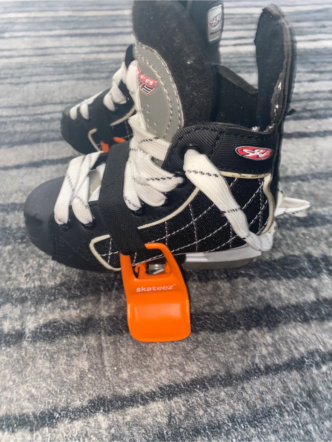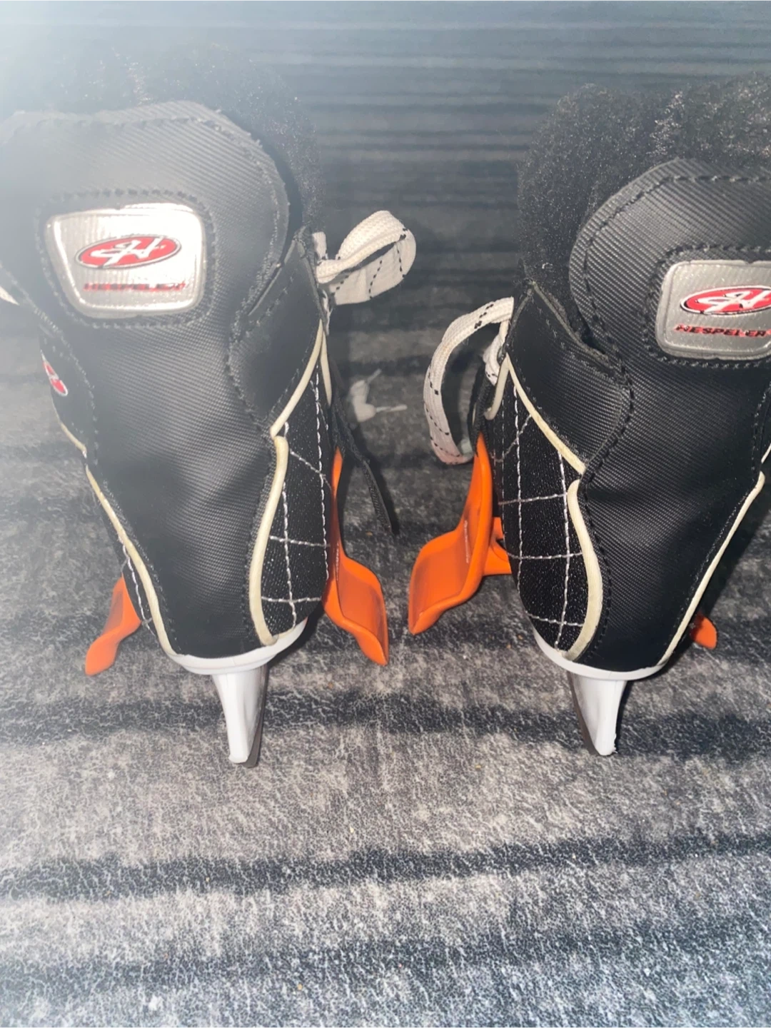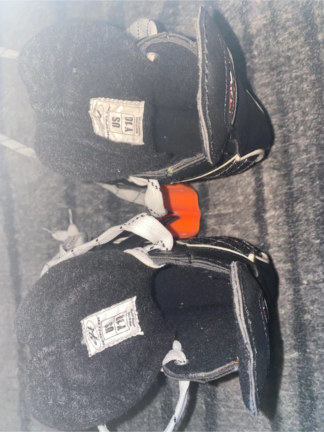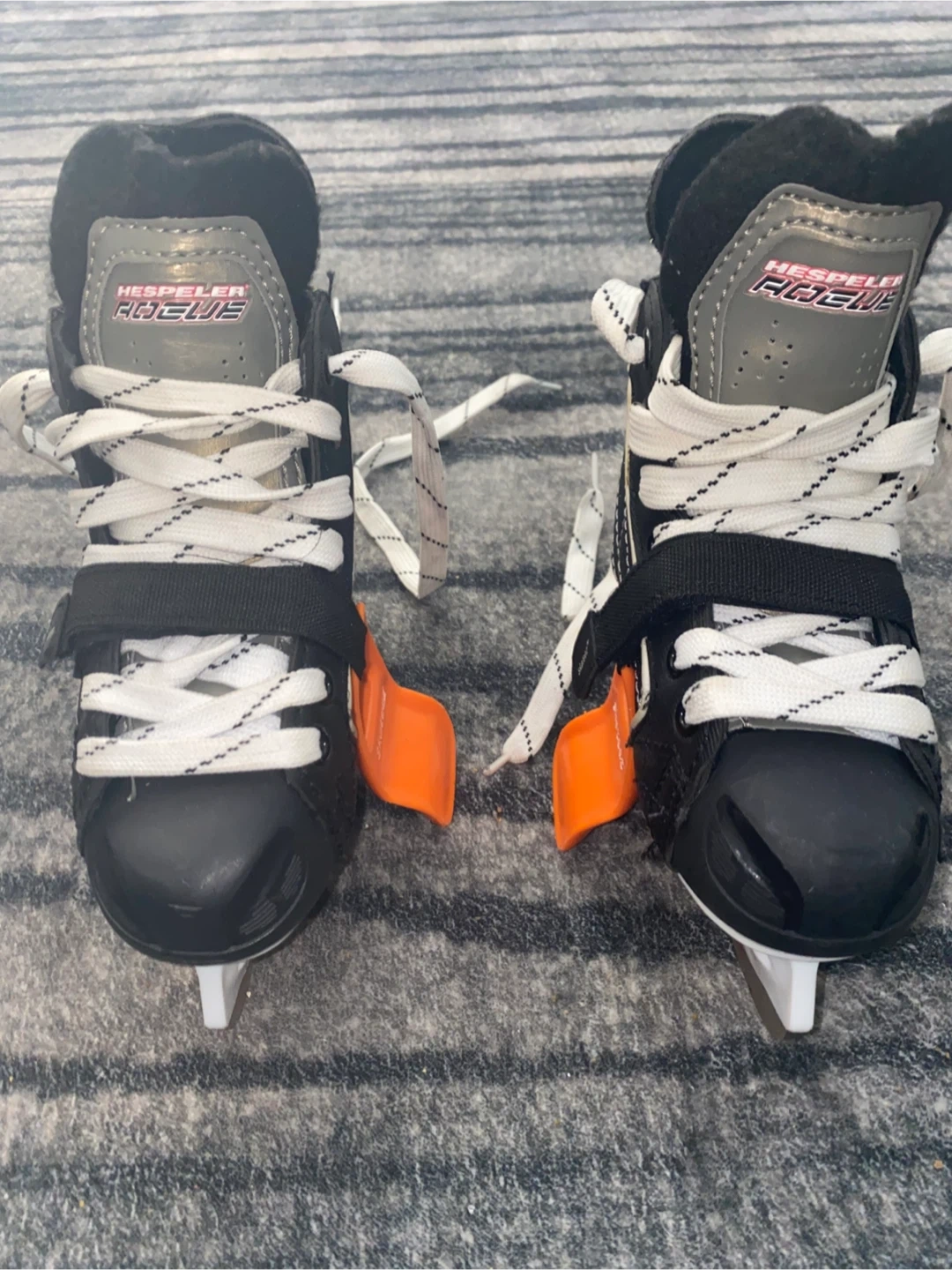 Hespeler Rogue youth ice skates in black. Size US Y10. Includes orange skate guards. Good for learning to skate! Rarely used.