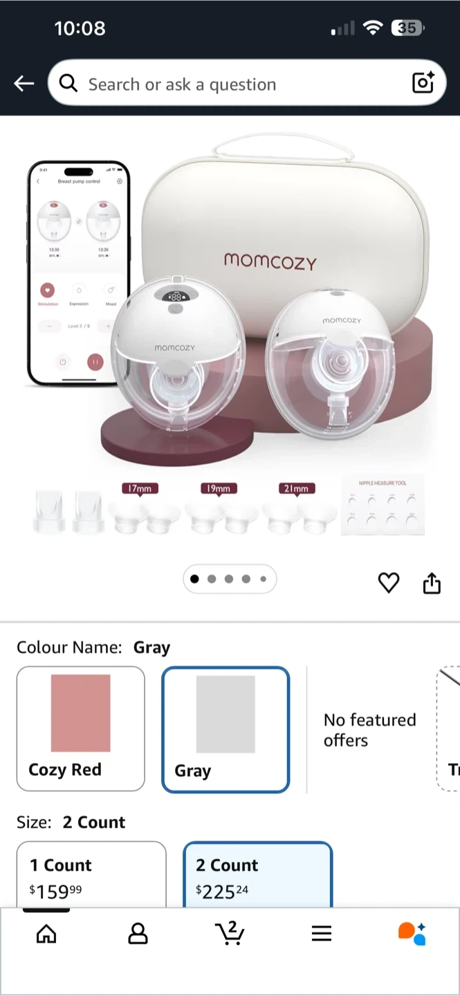 Momcozy wearable breast pump in gray. This 2-count set includes multiple flange sizes: 17mm, 19mm, and 21mm, along with a nipple measure tool. It's a portable solution for milk expression.