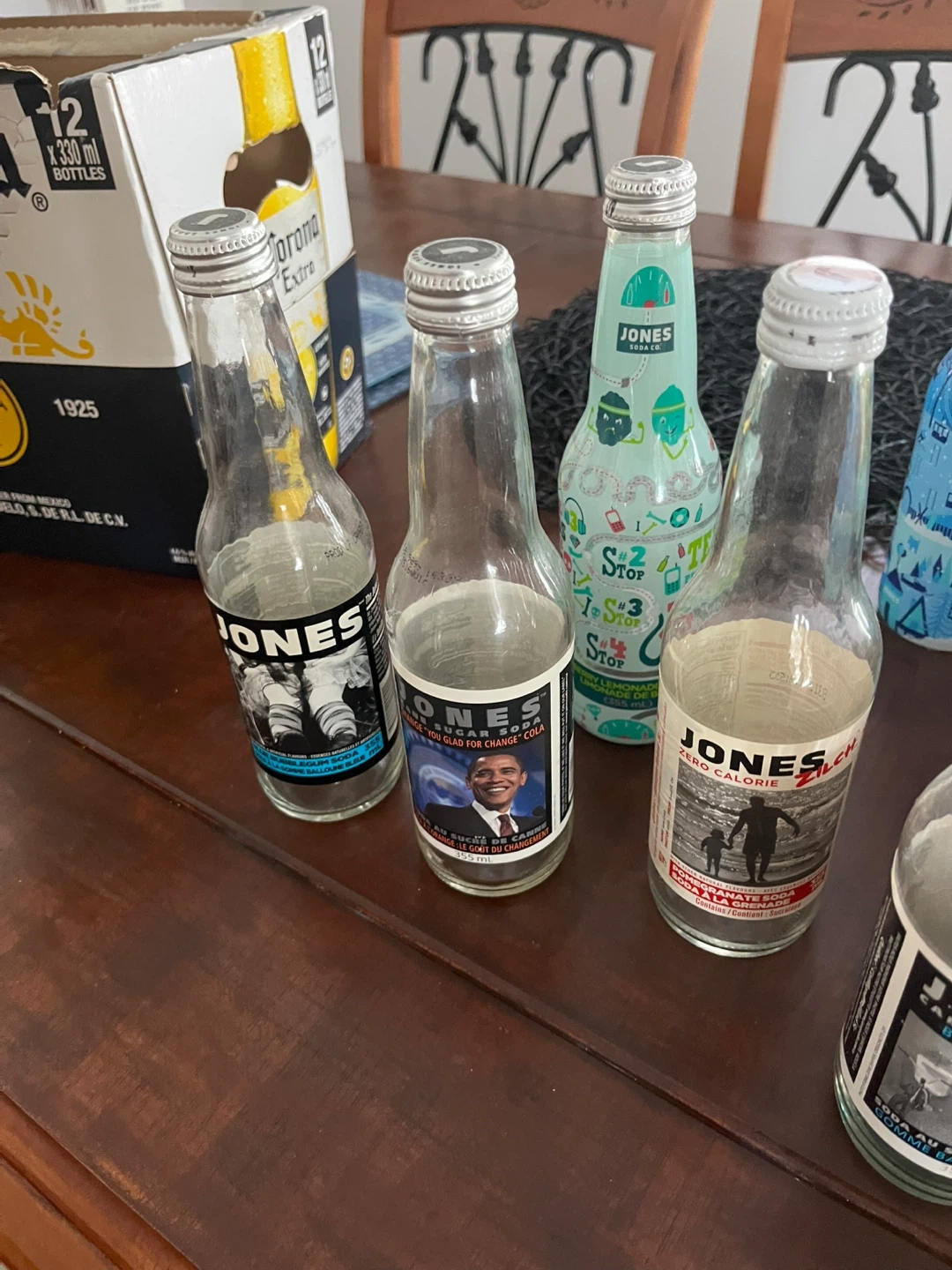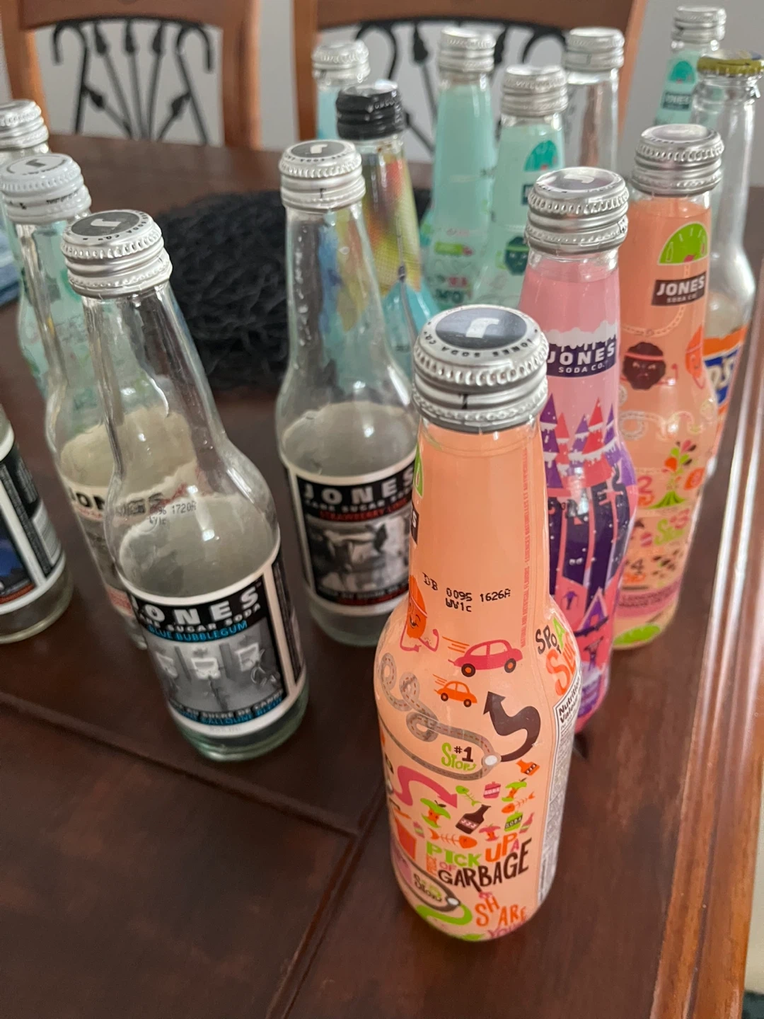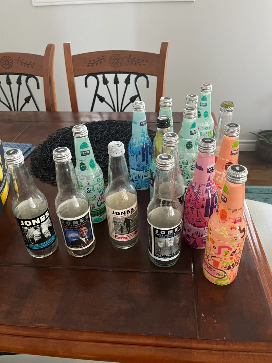 A collection of empty Jones Soda bottles with unique designs. These are standard 12oz bottles. A fun assortment for collectors or display!