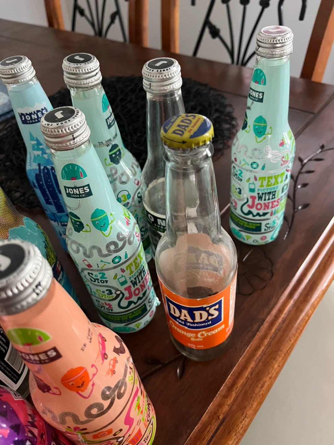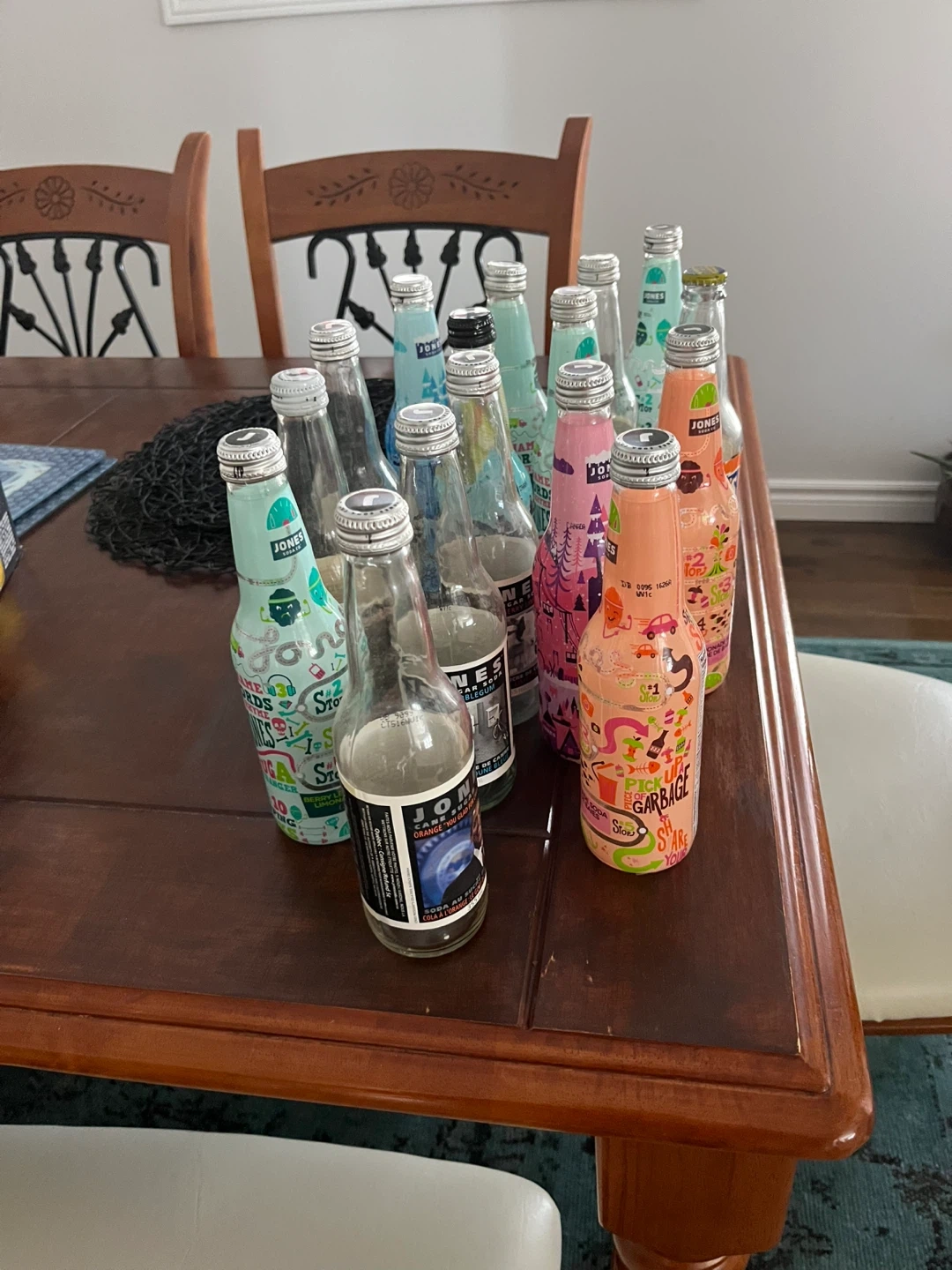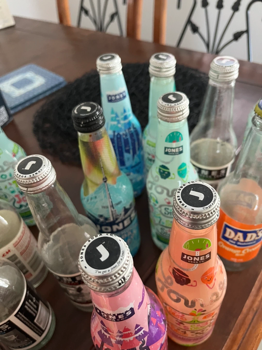 A collection of empty Jones Soda bottles with unique designs. These are standard 12oz bottles. A fun assortment for collectors or display!