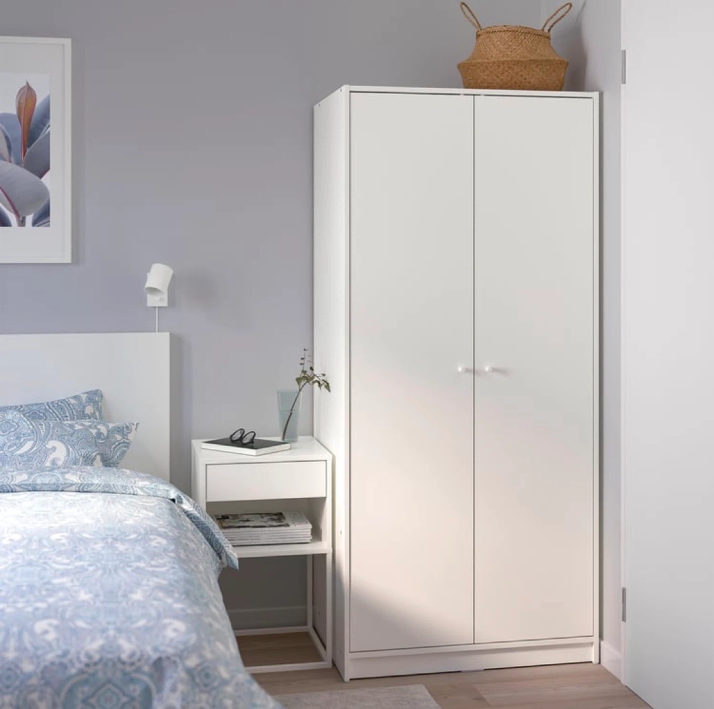 This is an IKEA white double-door wardrobe. It's a great storage solution for any bedroom. The interior includes a lower shelving.