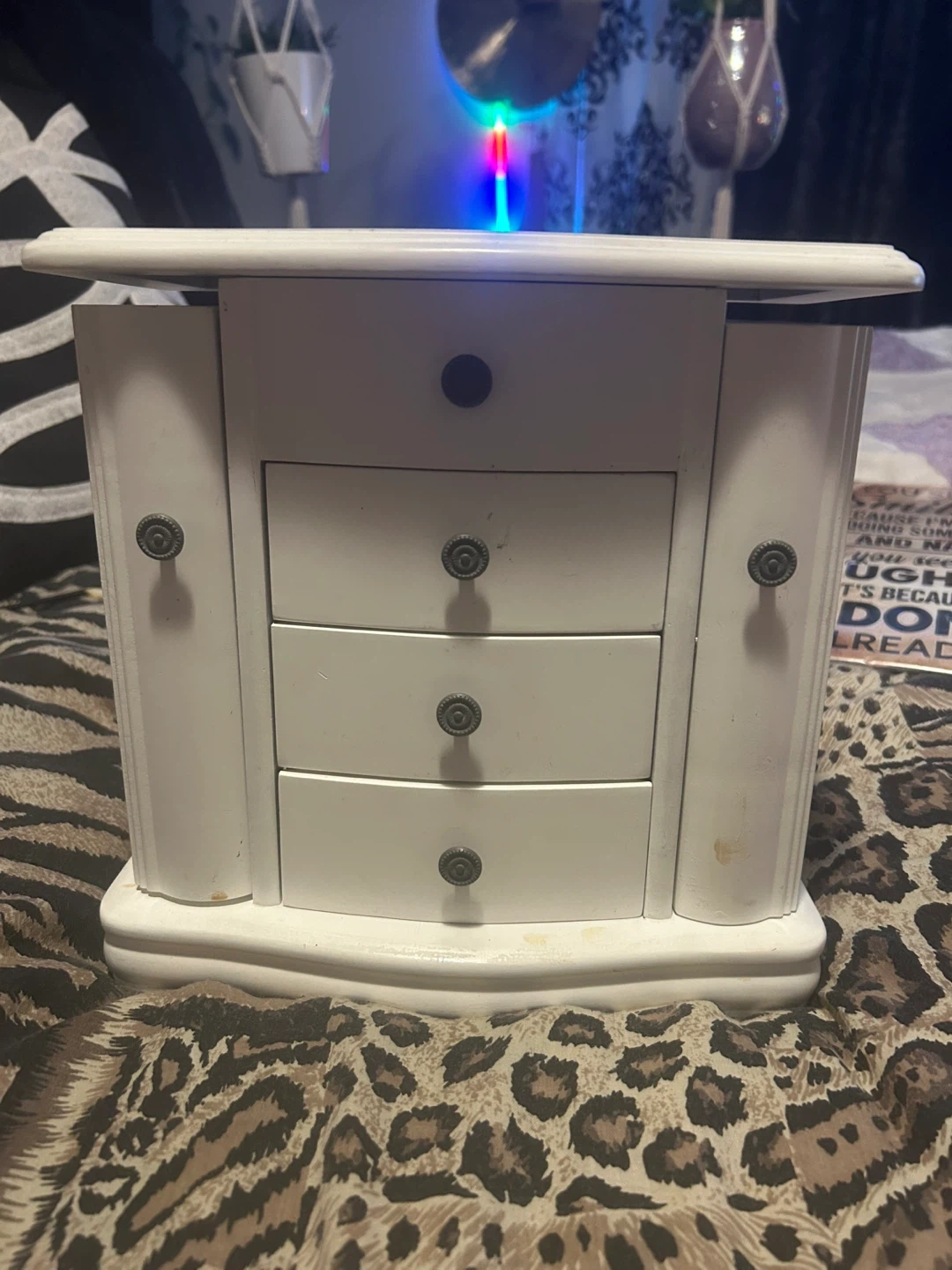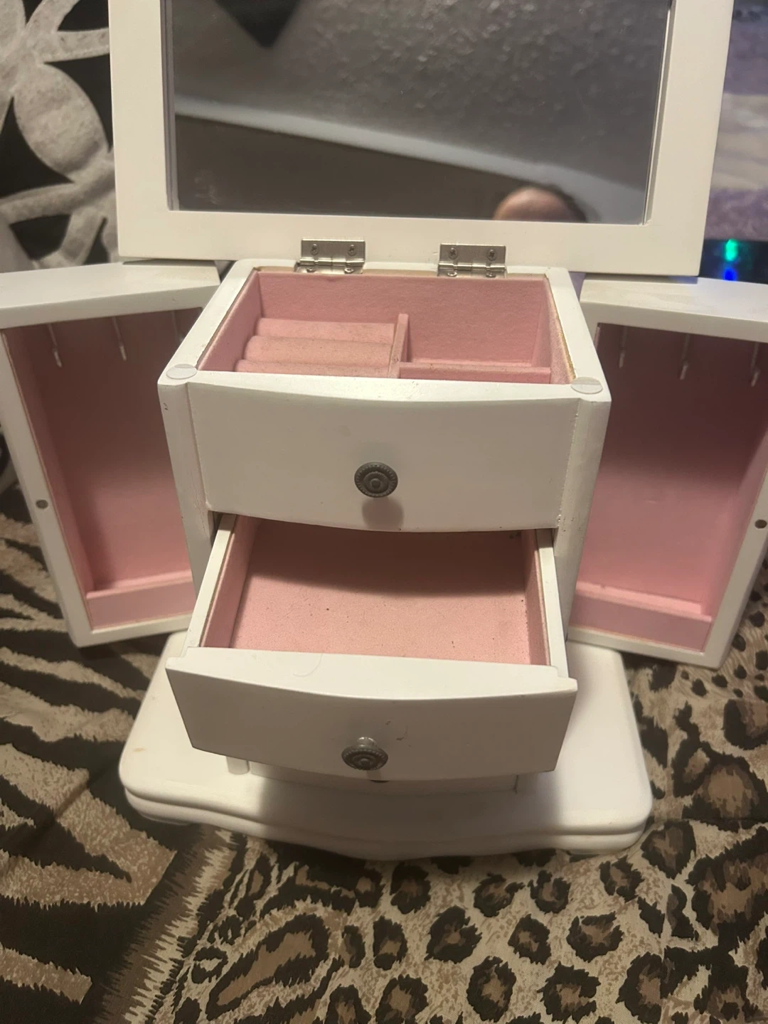 This white jewellery box features a mirror and multiple drawers for storage. It's lined with pink felt and has side compartments for necklaces or earrings. Keeps your trinkets organized!