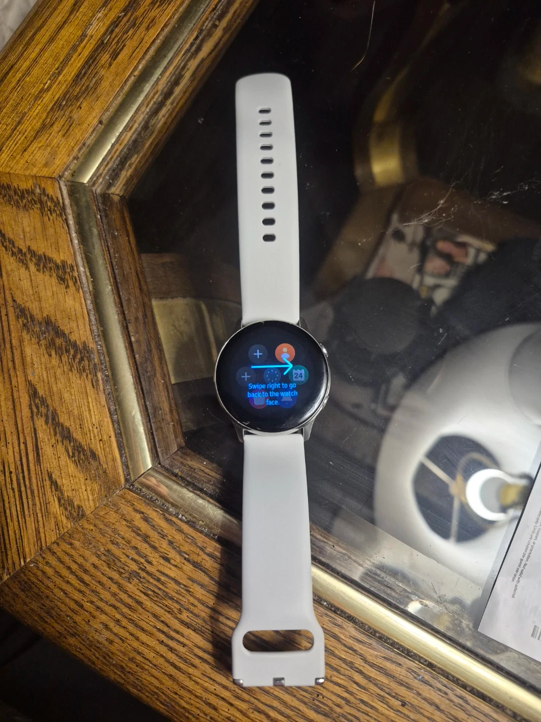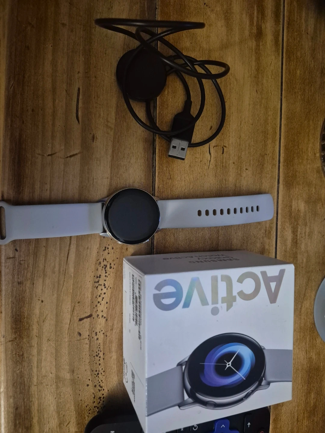 This is a Samsung Galaxy Watch Active 2 smartwatch. It's a silver 40mm model with a white silicone band. The watch comes with its charging cable and original box. It's great for tracking your fitness and staying connected on the go!