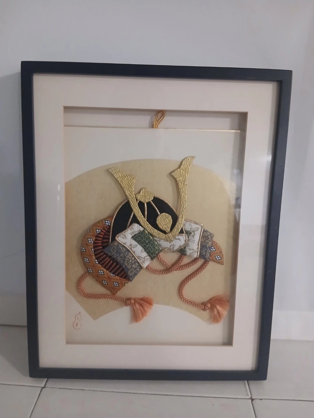 This is a framed artwork depicting a Japanese samurai helmet. It's made with fabric and gold thread, featuring decorative cords and tassels. The piece is presented in a black frame with a cream mat.