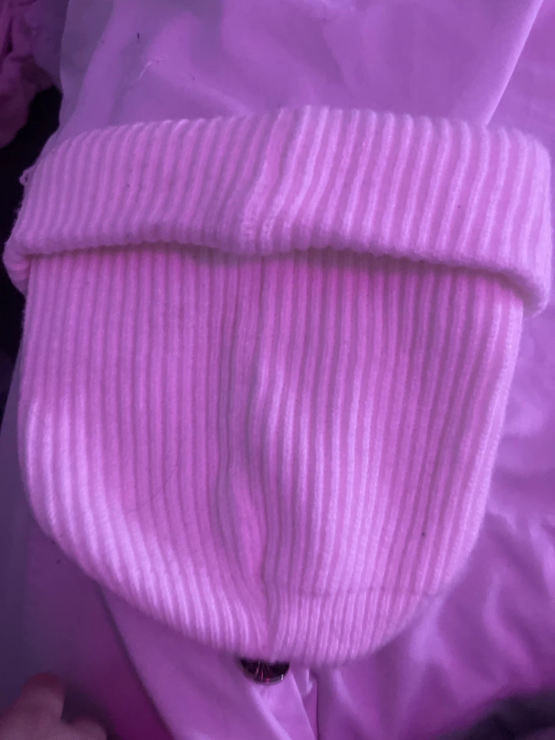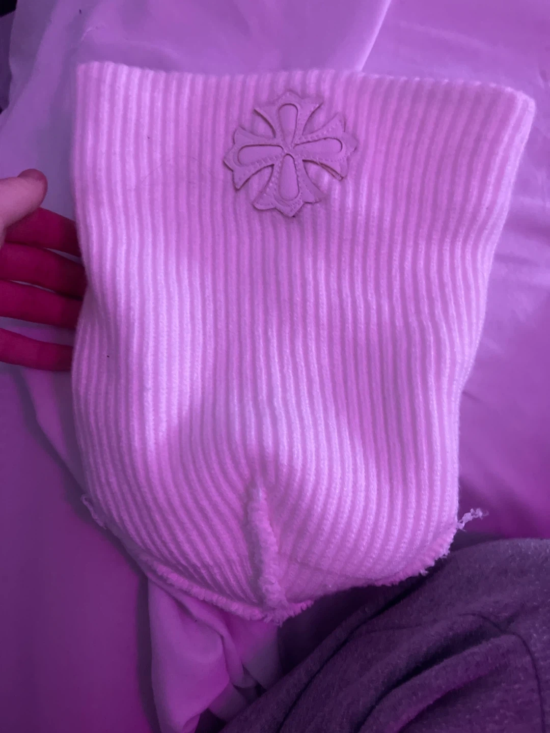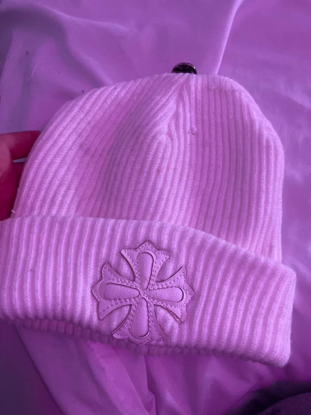 White ribbed beanie. Features a faux leather cross emblem on the cuff. Knit material. It was some spots can come out in wash