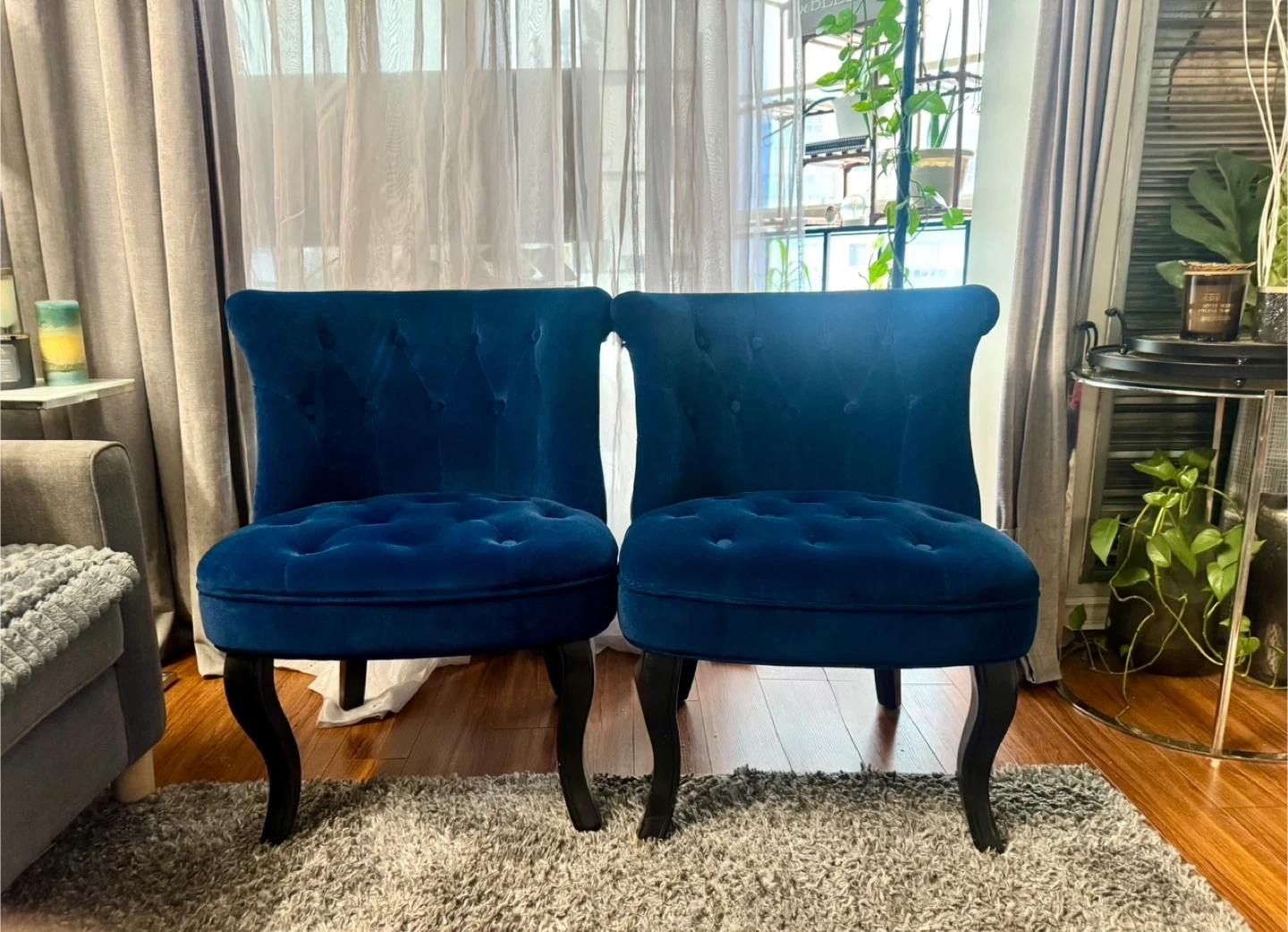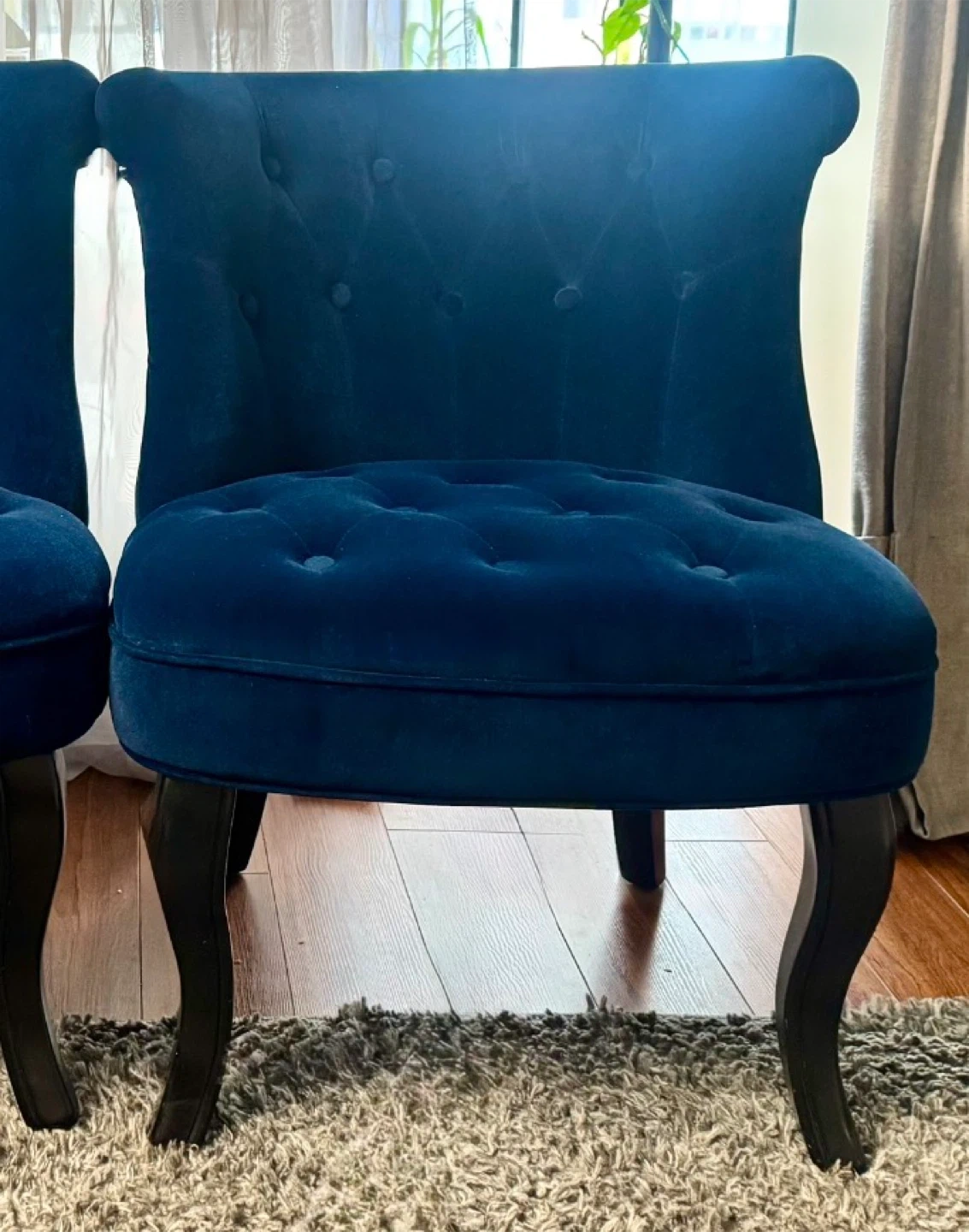 Two charming blue velvet accent chairs with tufted backs and cushioned seats. These chairs feature dark, curved legs for a touch of elegance. Upholstered in soft velvet, they're perfect for adding a stylish seating option to any room. Velvet material.