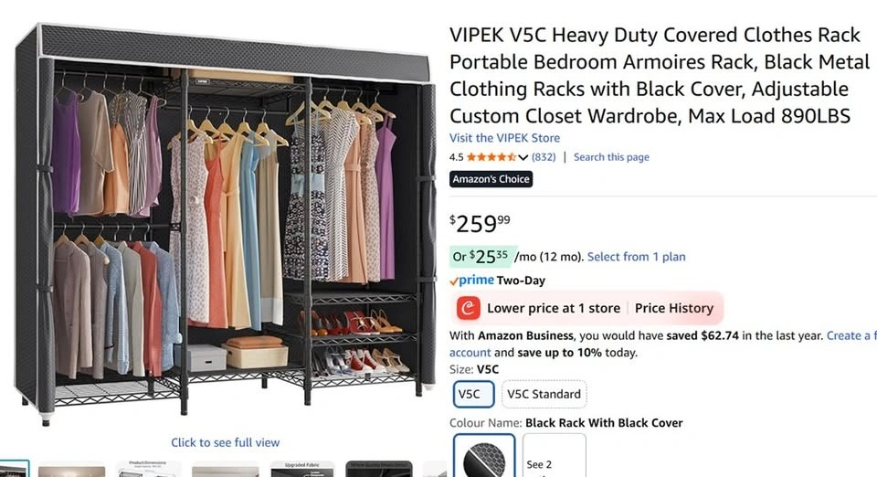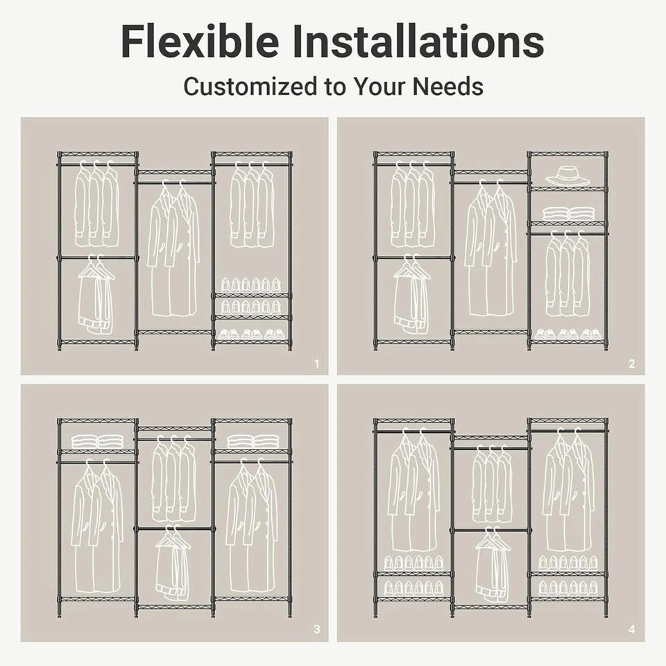Brand new, still in the sealed box. Black metal clothing rack with a black cover. Dimensions are 70.1" L x 17.3" W x 76.4" H. It has a load capacity up to 890 lbs. The single hanging rod supports up to 60 lbs, and each wire shelf supports up to 88 lbs. This offers customizable closet storage with 8 adjustable shelves and 4 removable hanging rods. You can raise or lower the shelving to maximize space. The durable powder-coated steel construction helps protect against rust and water damage for long-lasting use. The zippered Oxford fabric cover keeps clothing dust-free and provides enclosed wardrobe space. Easy assembly with multi-style configuration options to customize storage.