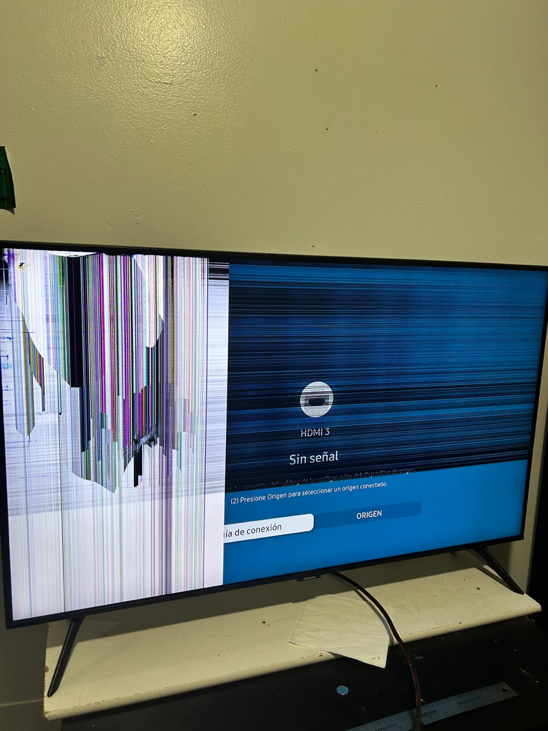 This is a Samsung television with a cracked screen. The screen shows vertical lines and discolouration on the left side. For parts or repair only.