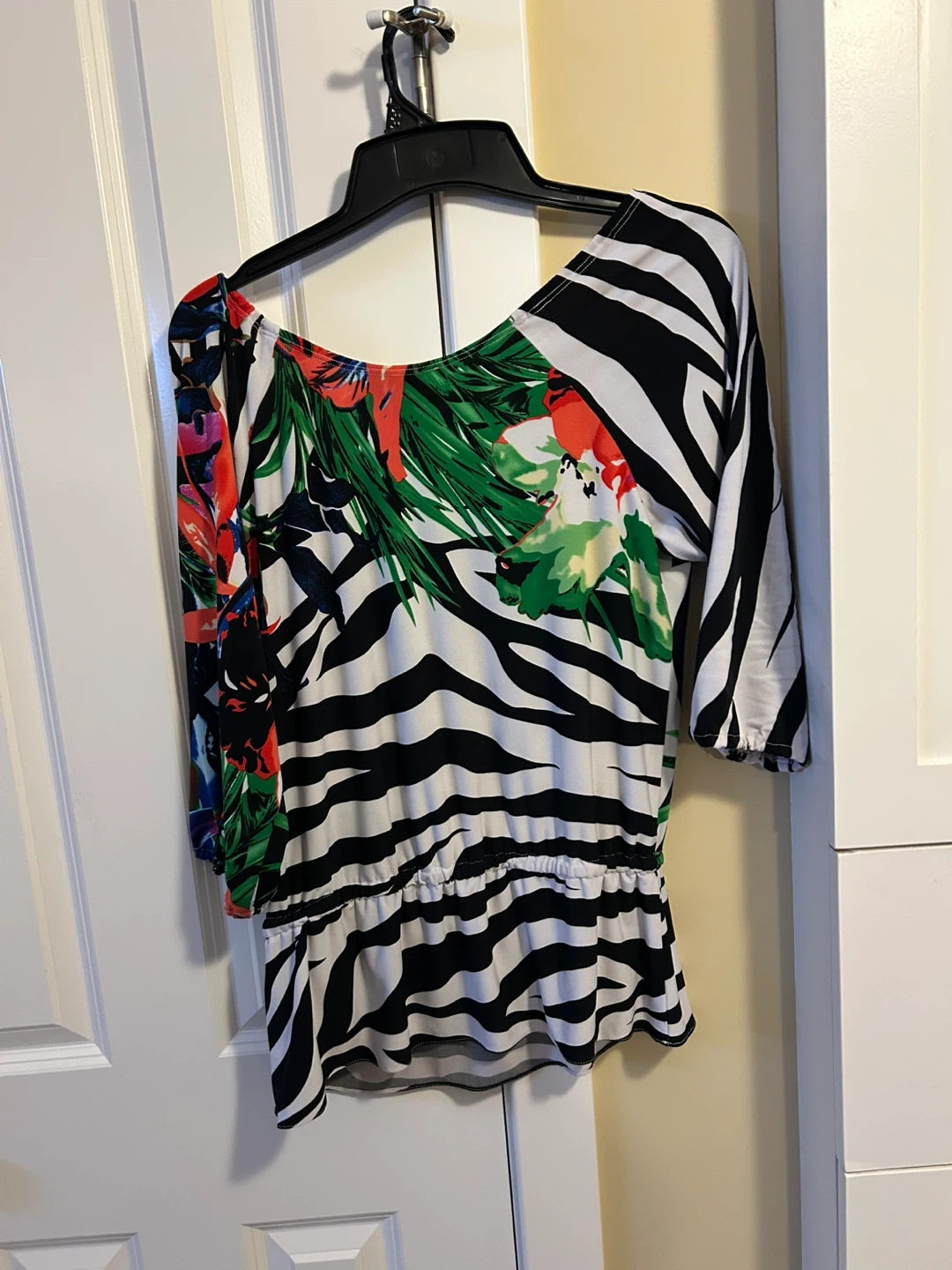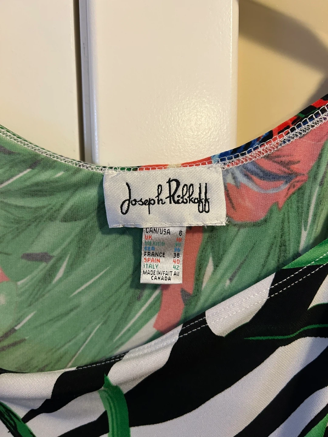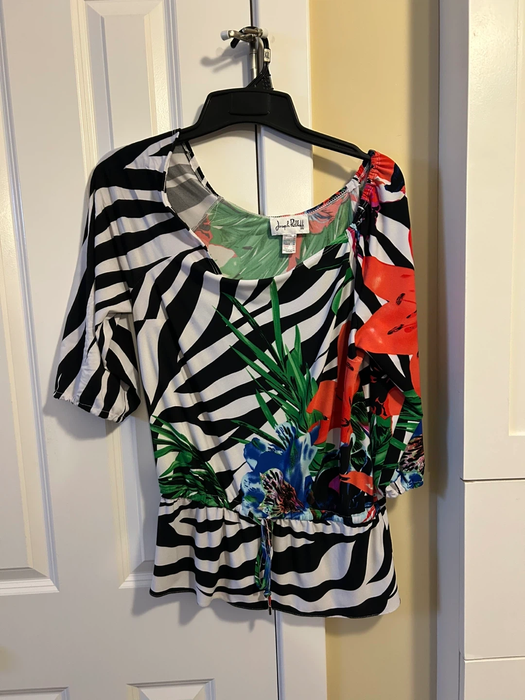 A stylish Joseph Ribkoff women's top with a bold zebra and floral print. It has a relaxed fit with a cinched waist and dolman sleeves. Great for adding a pop of pattern to your wardrobe!