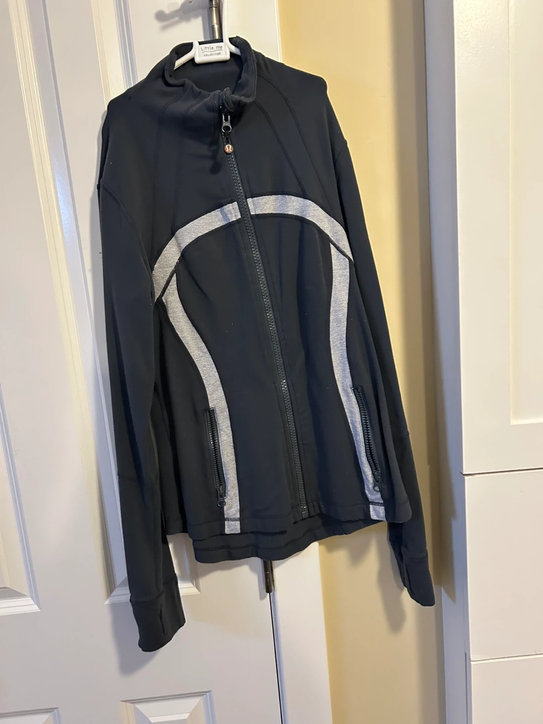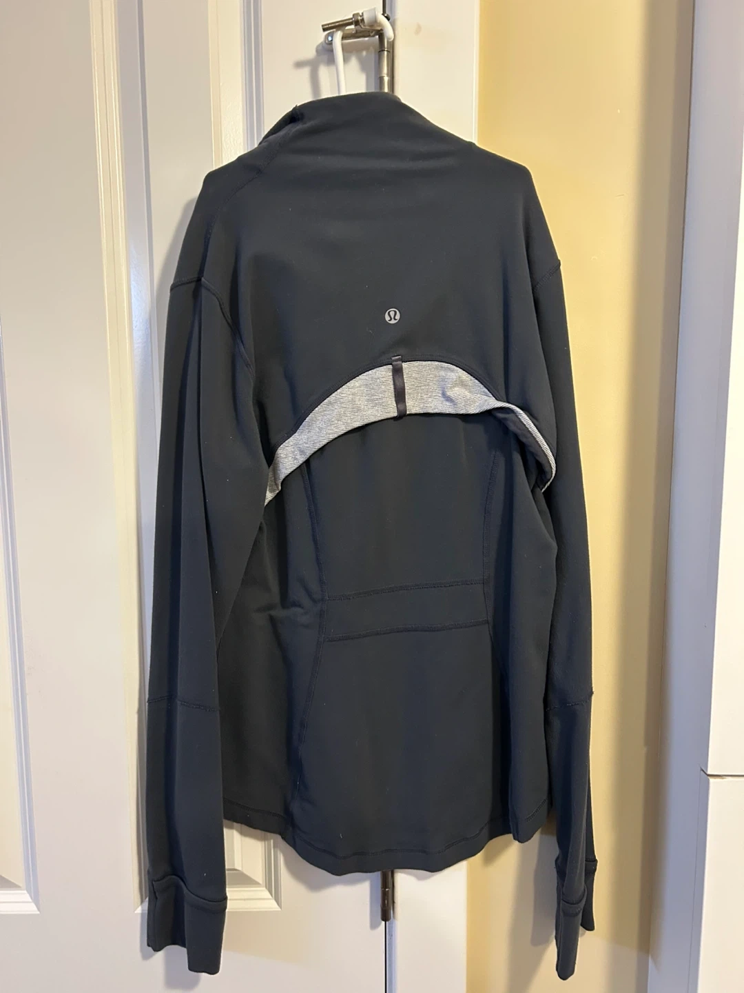 This is a Lululemon gun grey full zip jacket. It's made with a comfortable athletic fabric and features zippered pockets. Thumbholes at the cuffs add extra coverage.