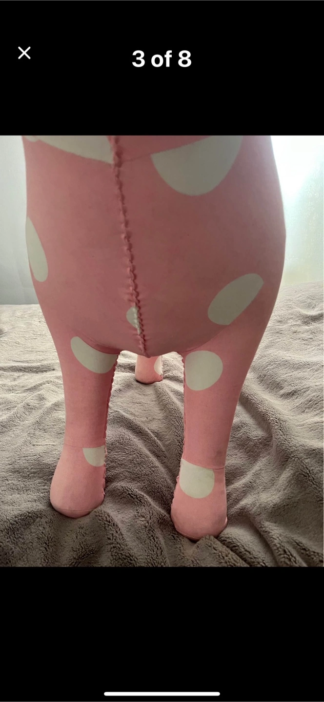 Cute pink plush dog with white polka dots. It's a fun decorative item. Some minor scuffs visible on the fabric.
