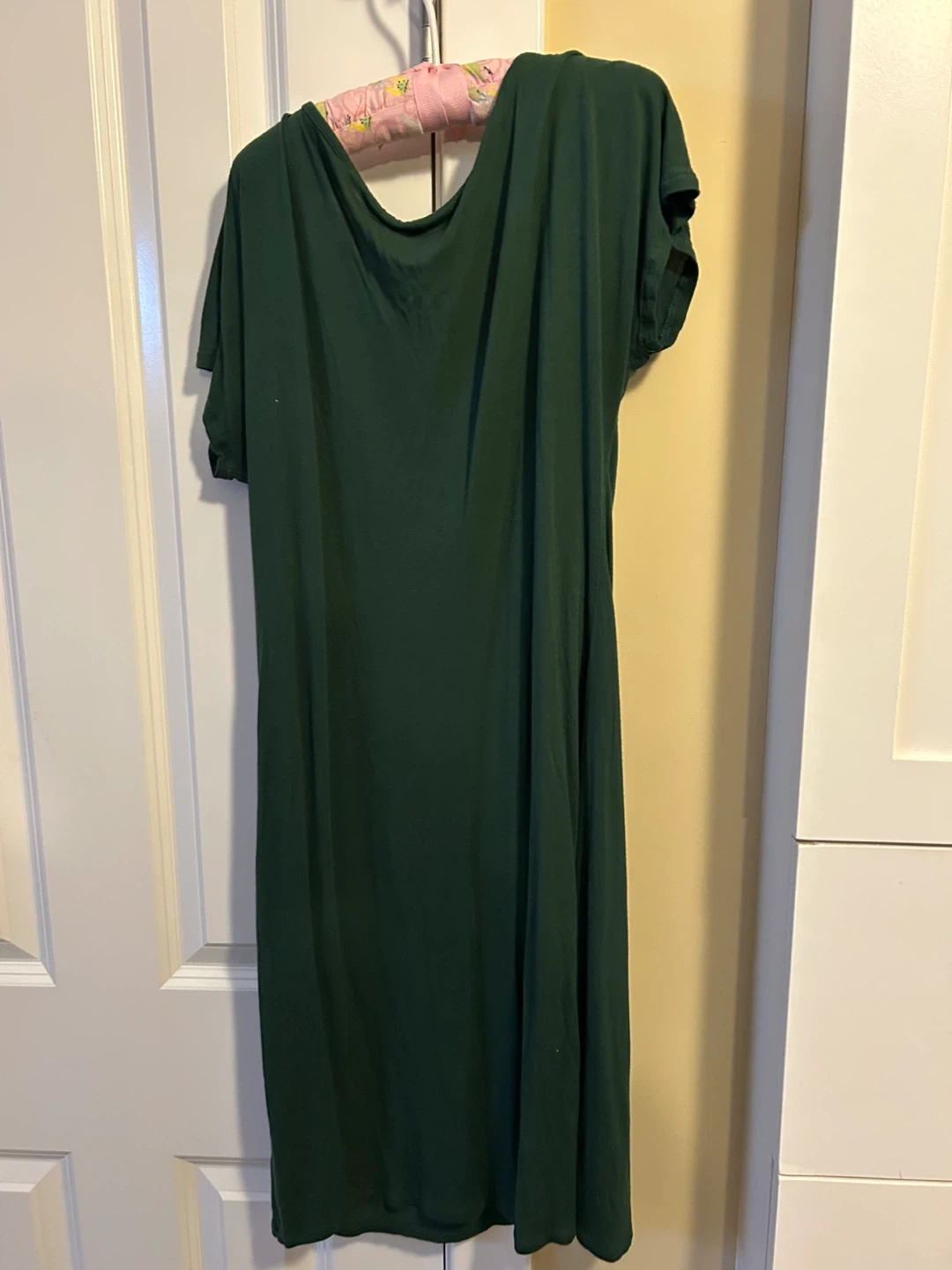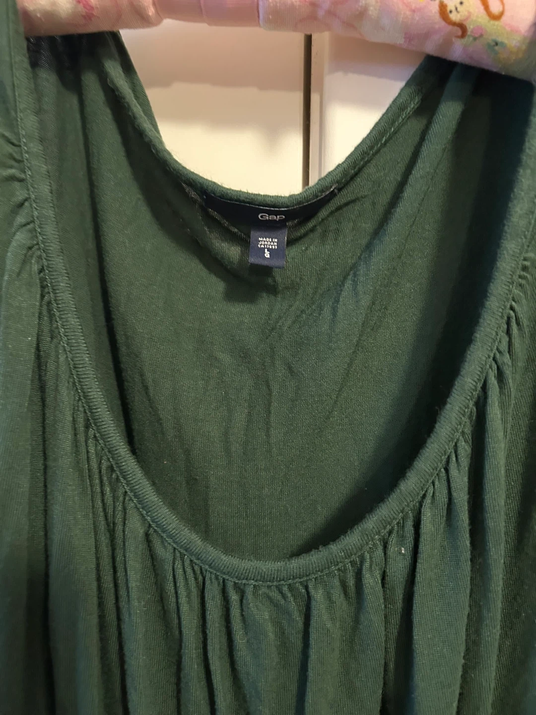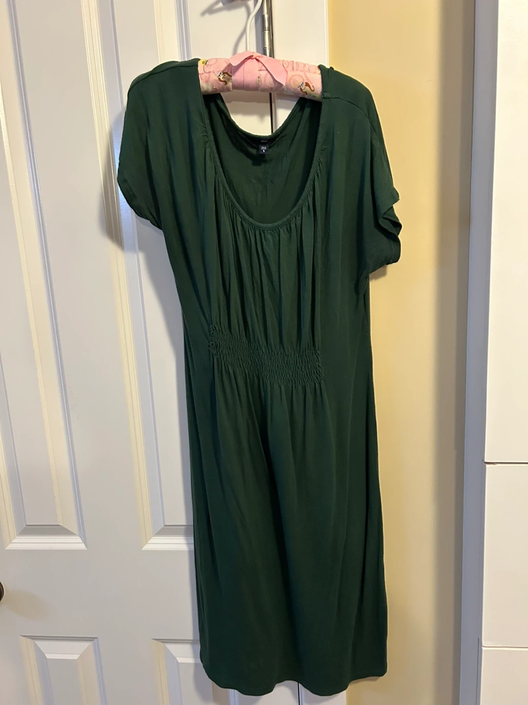 This GAP dress is a lovely dark green colour. It features a gathered neckline and a smocked waistband. Easy to wear, it's perfect for casual outings.