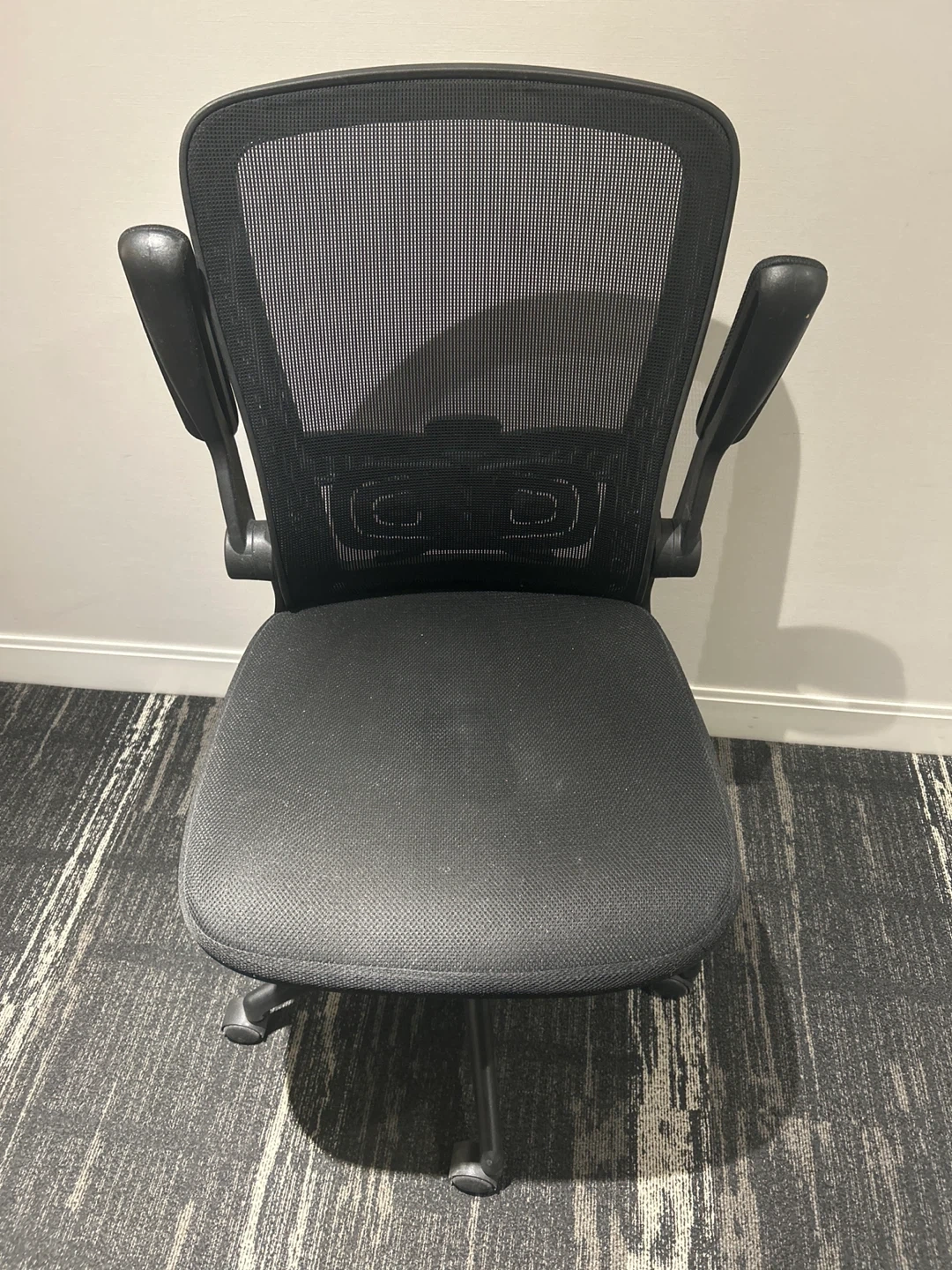 This is a black mesh office chair. It features adjustable armrests and a padded seat. The chair has a sturdy base with wheels for easy mobility.