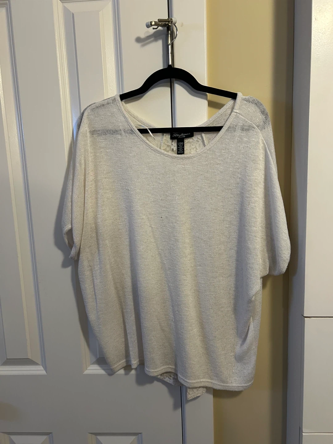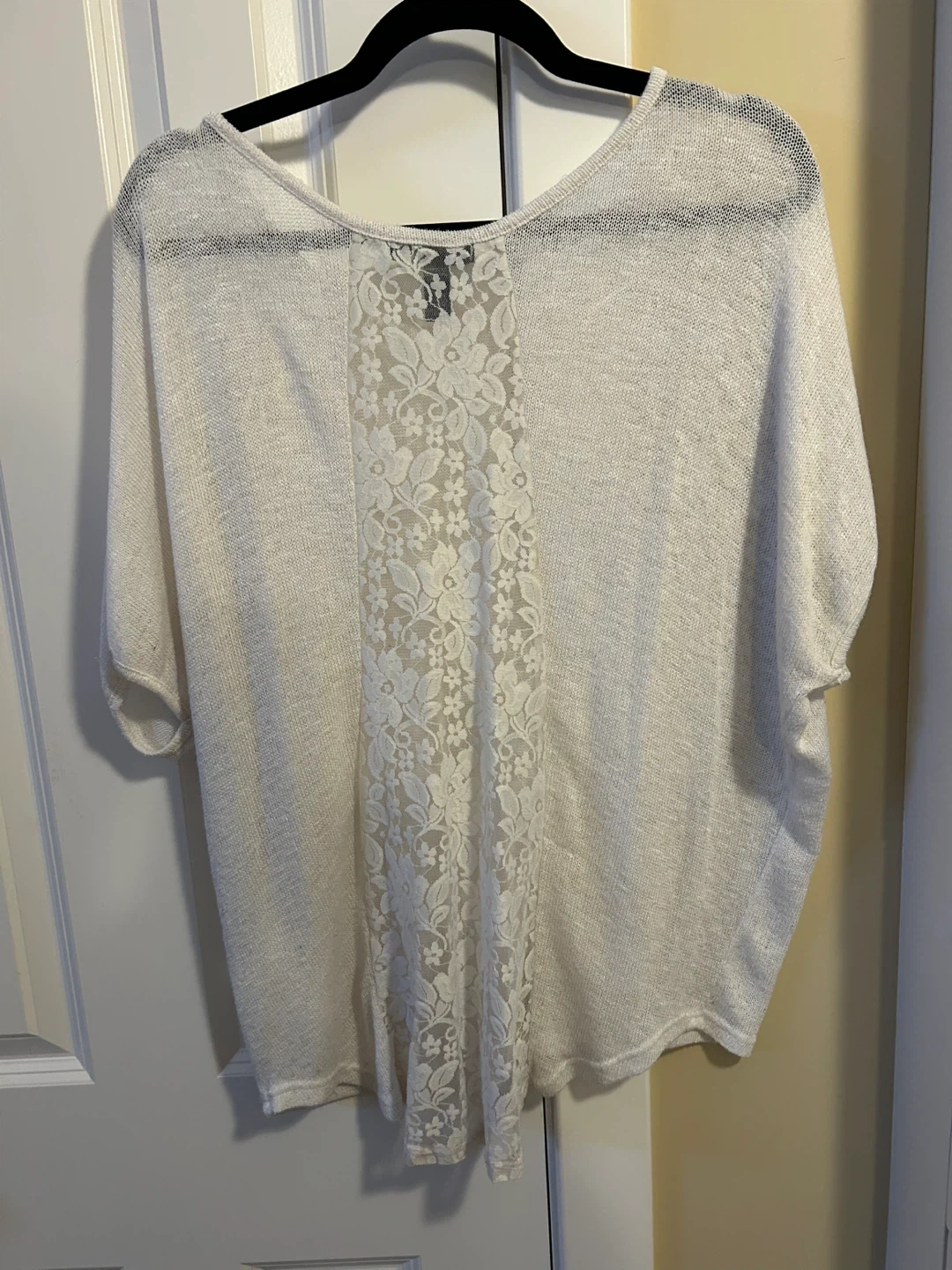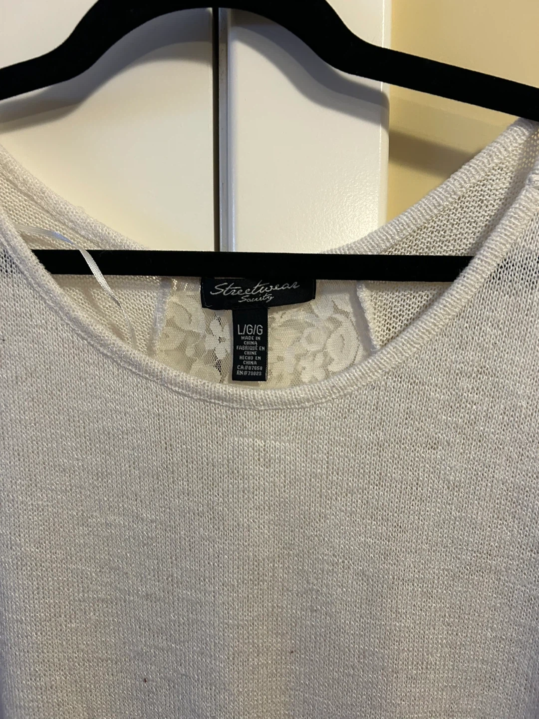This cream knit top from Streetwear Society features a beautiful lace panel down the back. It's a size L/G with a relaxed, oversized fit. Perfect for layering or wearing on its own!